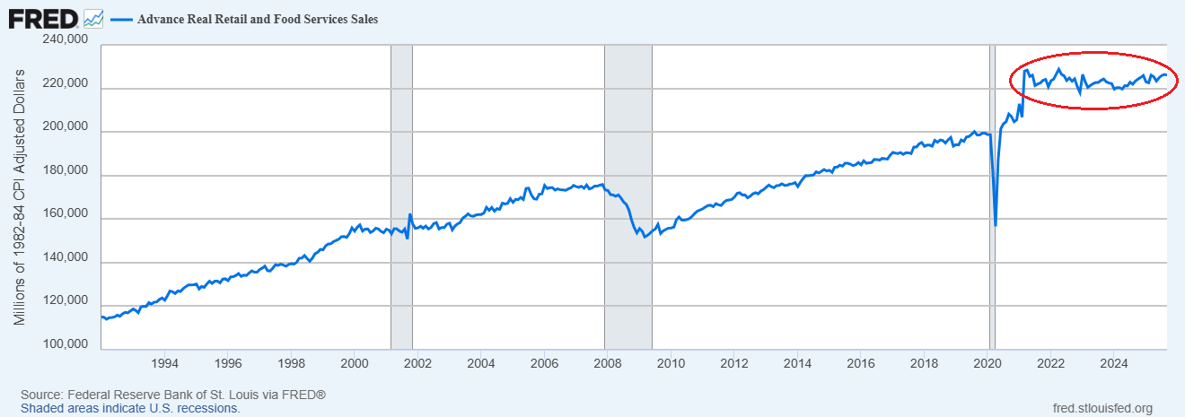 Vàng và bạc đều tăng mạnh khi dữ liệu doanh số bán lẻ thiếu tích cực cho thấy nhu cầu tiêu dùng đang chững lại. Doanh số bán lẻ thực tế gần như không tăng kể từ năm 2021, phản ánh sự thiếu vắng động lực kinh tế. Khi không có dấu hiệu phục hồi trong tiêu dùng hộ gia đình, nhà đầu tư càng lo ngại rủi ro suy thoái và tìm đến vàng như tài sản trú ẩn.