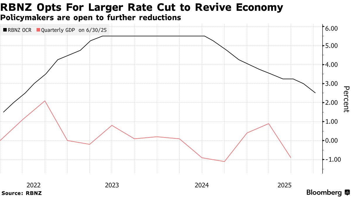Ủy ban Chính sách Tiền tệ của Ngân hàng Dự trữ đã giảm Lãi suất Tiền mặt Chính thức xuống 2.5% từ 3% vào thứ Tư tại Wellington, một động thái được dự đoán bởi 10 trong số 25 nhà kinh tế trong khảo sát của Bloomberg. Mười lăm người dự đoán giảm 25 điểm.