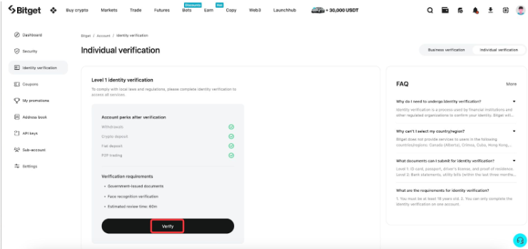 - Đăng nhập vào Bitget, nhấn biểu tượng hồ sơ → chọn “Xác thực danh tính”.