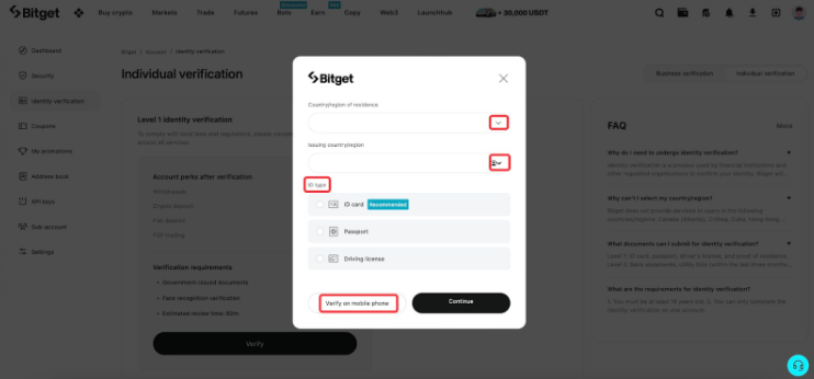 Nhấp vào các menu thả xuống được đánh dấu bên dưới để chọn Quốc gia/khu vực cư trú và Quốc gia/khu vực cấp (của giấy tờ tùy thân của bạn). Chọn loại ID ưa thích của bạn và nhấp vào [Tiếp tục] để tiếp tục trên laptop hoặc [Xác minh trên điện thoại di động]. Chúng tôi khuyên bạn chọn tùy chọn [Xác minh trên điện thoại di động] vì bạn sẽ cần phải chụp ảnh giấy tờ tuỳ thân của mình.