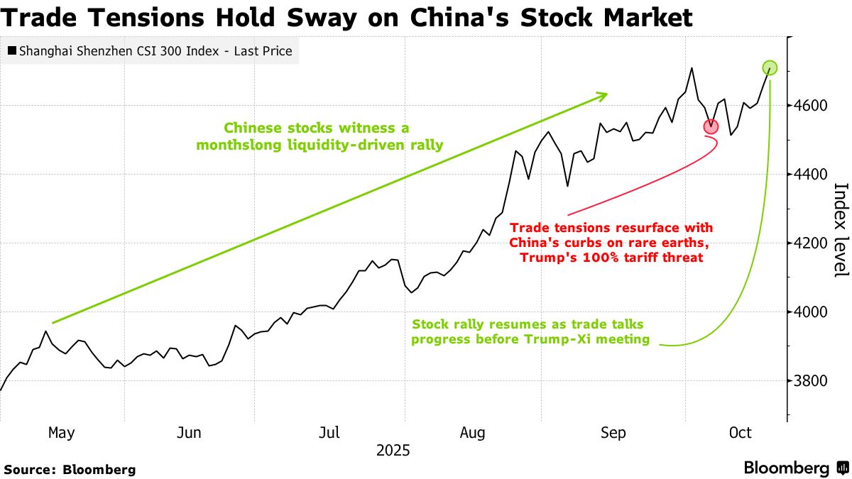 Tập Cận Bình và Trump được kỳ vọng sẽ hoàn tất một thỏa thuận trong tuần này tại Hàn Quốc khi họ gặp trực tiếp lần đầu tiên kể từ khi tổng thống Mỹ quay trở lại nắm quyền. Sự lạc quan về tiến triển trong các cuộc đàm phán thương mại Trung-Mỹ đã khiến chỉ số CSI 300 tăng 1,2% vào thứ Hai - mức tăng lớn nhất trong khoảng một tuần.