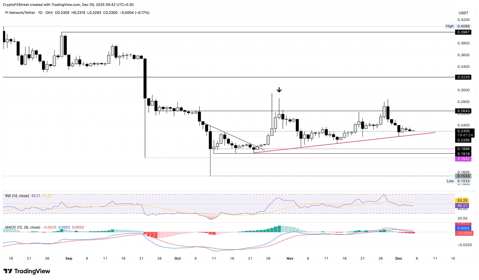 PI đang điều chỉnh về đường xu hướng hỗ trợ cục bộ được hình thành từ các đáy ngày 22 tháng 10 và 4 tháng 11. Đường này nhiều lần tạo nền phục hồi nhưng hiện đang chịu áp lực kiểm định lại. Nếu giá phá xuống dưới mức đáy ngày 1 tháng 12 tại $0.2204, đà giảm có thể mở rộng về mốc tâm lý $0.2000, sau đó là vùng hỗ trợ $0.1919, trùng đáy ngày 11 tháng 10.