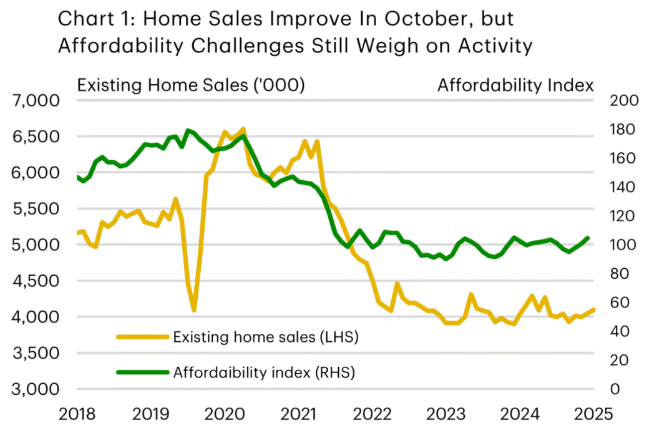 Dữ liệu kinh tế bắt đầu quay trở lại, với báo cáo bảng lương tháng 9 là tiêu điểm. Tuy nhiên, tình trạng chậm trễ báo cáo dự kiến vẫn kéo dài: bảng lương tháng 10 sẽ đi kèm số liệu tháng 11 vào ngày 16 tháng 12—quá muộn cho cuộc họp FOMC ngày 9–10 tháng 12. Các dữ liệu quan trọng khác như CPI tháng 10 cũng chưa thể công bố. Trong lĩnh vực nhà ở, doanh số bán nhà hiện có tăng nhẹ nhờ lãi suất thế chấp giảm, nhưng thị trường vẫn đứng yên khi khả năng chi trả còn hạn chế dù đã có cải thiện nhỏ gần đây (Biểu đồ 1).