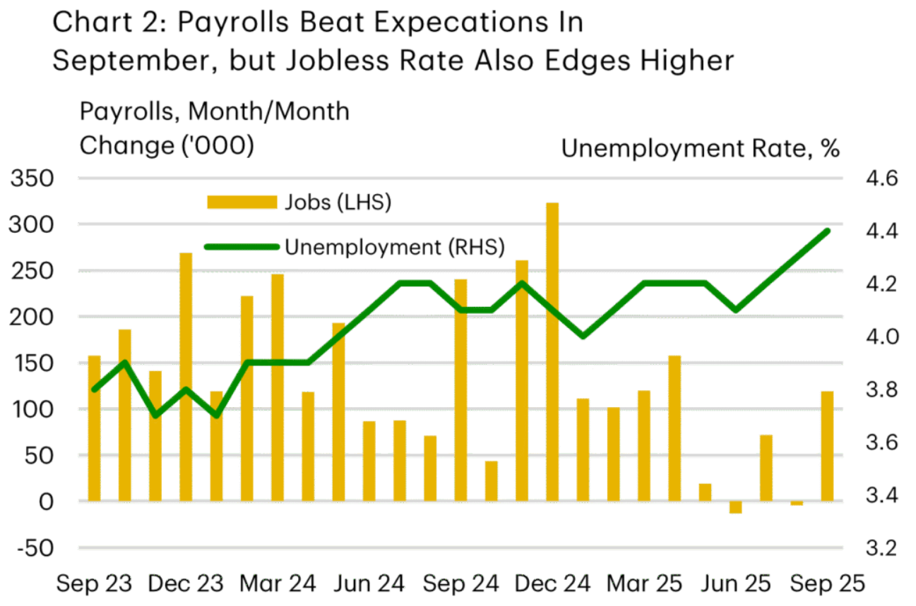 Báo cáo bảng lương tháng 9 bị trì hoãn không đủ để thu hẹp khác biệt này. Phe hawkish có thêm lý do nhờ mức tăng việc làm tốt: 119,000—mạnh nhất từ tháng 4 (Biểu đồ 2). Nhưng phe dovish sẽ chỉ ra các điều chỉnh giảm của những tháng trước, sự tập trung hẹp của mức tăng việc làm, và tỷ lệ thất nghiệp đi lên.