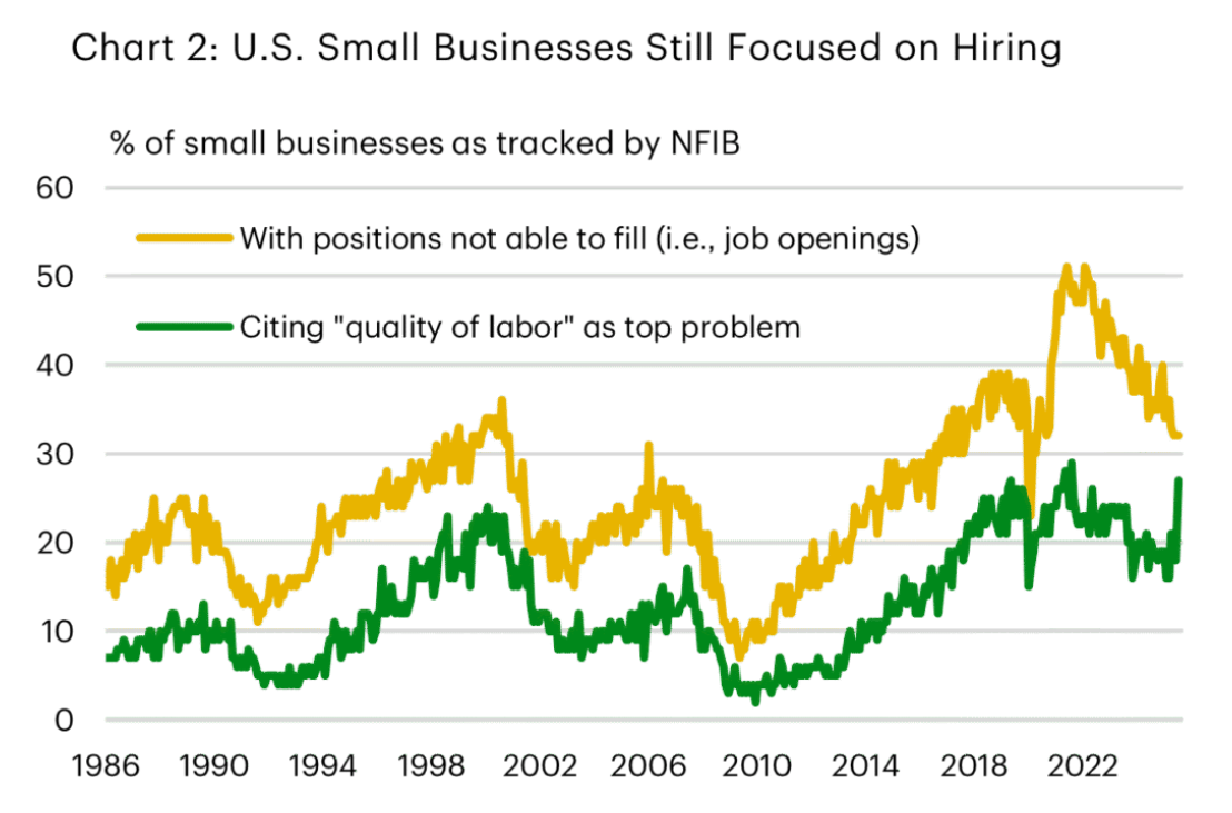 Khi các cơ quan như BLS nối lại hoạt động, những dữ liệu bị trì hoãn sẽ dần được công bố, dù lịch sửa đổi hiện vẫn chưa rõ. Trong thời gian chờ đợi, số đơn xin trợ cấp thất nghiệp khung tuần vẫn nằm gần các mức gần đây (Biểu đồ 1). Các doanh nghiệp nhỏ tiếp tục ưu tiên ổn định nhân sự. Mức thay đổi việc làm trung bình vẫn hơi âm, nhưng khảo sát NFIB tháng 10 tiếp tục cho thấy xu hướng “tuyển ít, sa thải ít”. Cơ hội việc làm đã giảm khỏi đỉnh thời kỳ đại dịch nhưng vẫn nằm trong vùng cao của lịch sử (Biểu đồ 2). Trong khi đó, tỷ lệ doanh nghiệp nhỏ xem “chất lượng lao động” là vấn đề lớn nhất tăng lên mức kỷ lục 27%, vượt xa các lo ngại về thuế (16%) và lạm phát (12%).