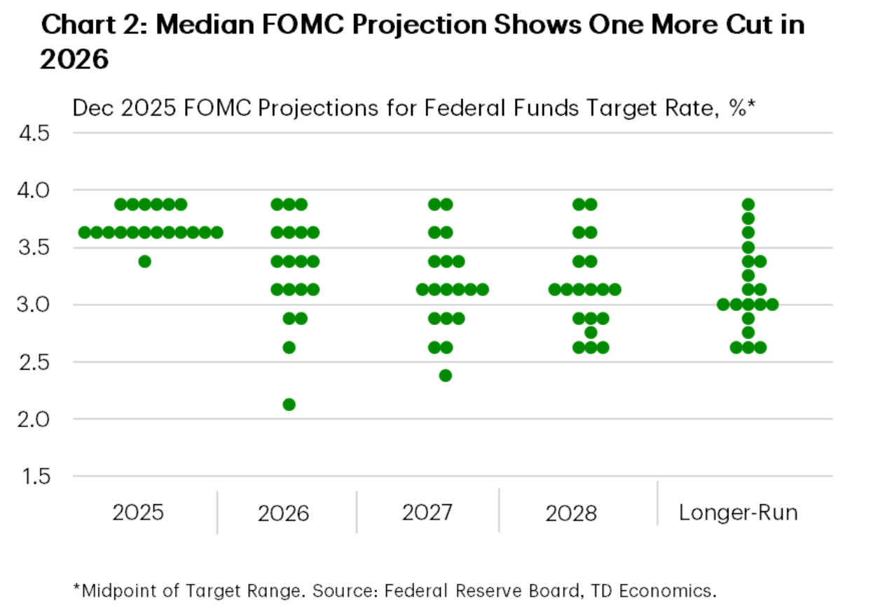 - Dự báo trung vị của FOMC cho thấy chỉ còn một lần cắt giảm lãi suất nữa trong năm 2026. Ở thời điểm hiện tại, TD Bank cho rằng Fed nhiều khả năng sẽ giữ nguyên lãi suất ít nhất đến tháng 6.