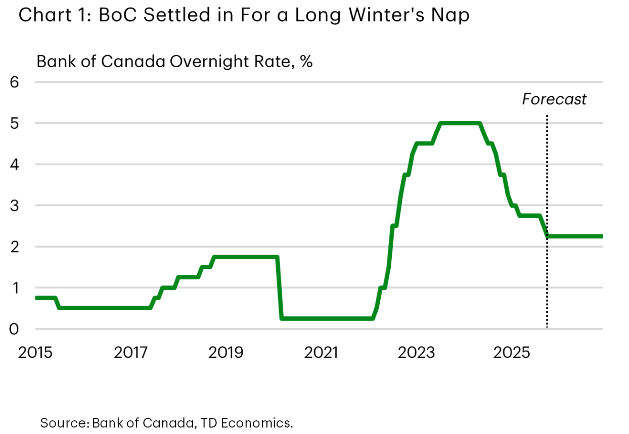 Trong thời gian tới, các báo cáo việc làm tích cực gần đây đã khiến thị trường bắt đầu tính đến khả năng có một lần tăng lãi suất trong năm tới. Tuy nhiên, khi bất ổn thương mại vẫn hiện hữu và quá trình rà soát hiệp định CUSMA (USMCA) đang đến gần, BoC nhấn mạnh rằng các quyết định chính sách sẽ phụ thuộc vào dữ liệu. Ở thời điểm hiện tại, kịch bản cơ sở là lãi suất chính sách sẽ tiếp tục được giữ ổn định trong những tháng tới, trừ khi các chỉ số kinh tế thay đổi đáng kể (Biểu đồ 1).