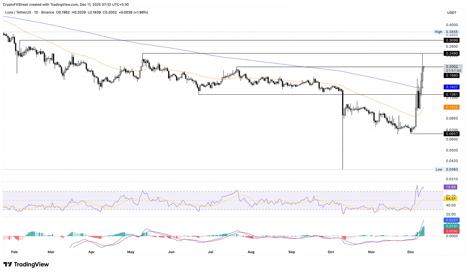 Ở chiều giảm, nếu Terra đảo hướng từ vùng $0.2000, giá có thể kiểm tra EMA 200 ngày tại $0.1427.