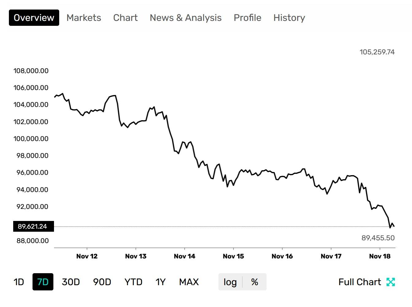 Tiền ảo tiếp tục là tâm điểm chú ý. Cặp BTC/USD tiếp tục giảm sâu, gần đây rơi xuống dưới 90,000 USD và giảm hơn 2.0% trước phiên châu Âu hôm nay. Cặp tiền này giảm gần 20% từ đầu tháng đến nay trong bối cảnh tâm lý né tránh rủi ro gia tăng.