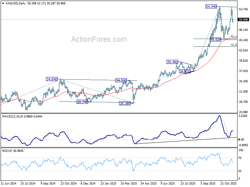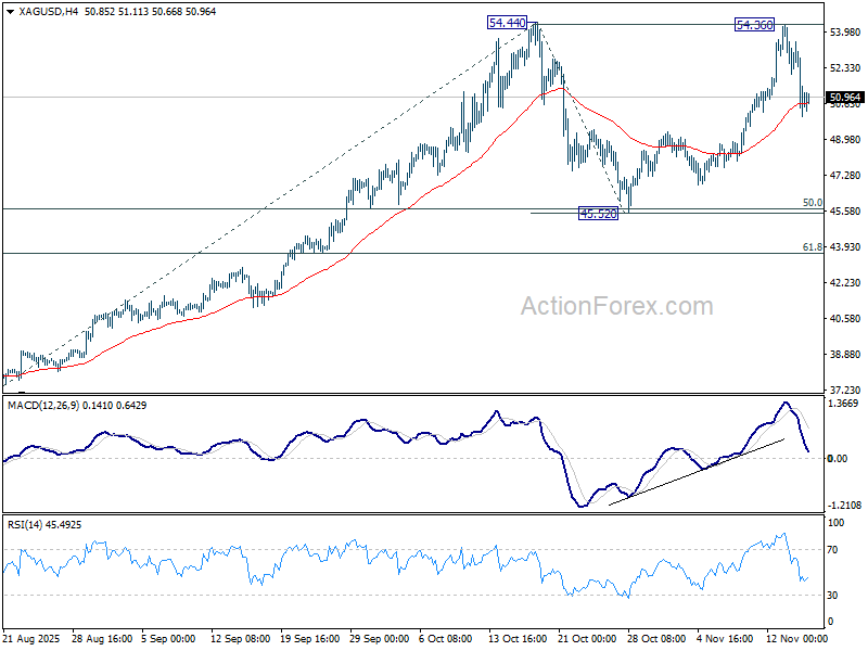 Bạc cũng đi theo mô hình tương tự. Nhịp giảm đầu từ 54.44 xuống 45.52 được nối bằng nhịp phục hồi lên 54.36 tuần trước, chỉ thấp hơn đỉnh cũ một chút. Việc duy trì giao dịch dưới EMA 55 giờ (hiện 50.678) sẽ xác nhận cấu trúc điều chỉnh và mở ra đà giảm về EMA 55 ngày (46.99) hoặc thấp hơn. Vùng hỗ trợ mạnh dự kiến nằm quanh cụm 45.52 (bao gồm mức 50% hồi từ 36.93 lên 54.44 tại 45.68), có thể chặn lại đà giảm và hoàn thiện mô hình tích lũy.