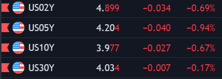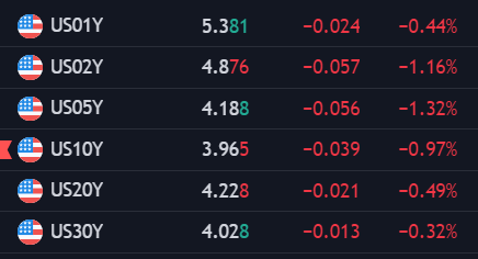 Lợi suất trái phiếu chính phủ Mỹ hiện đồng loạt giảm. Lợi suất trái phiếu kho bạc 10 năm giảm 4.5 bps xuống 3.965% và điều đó đang đè nặng lên đồng bạc xanh.