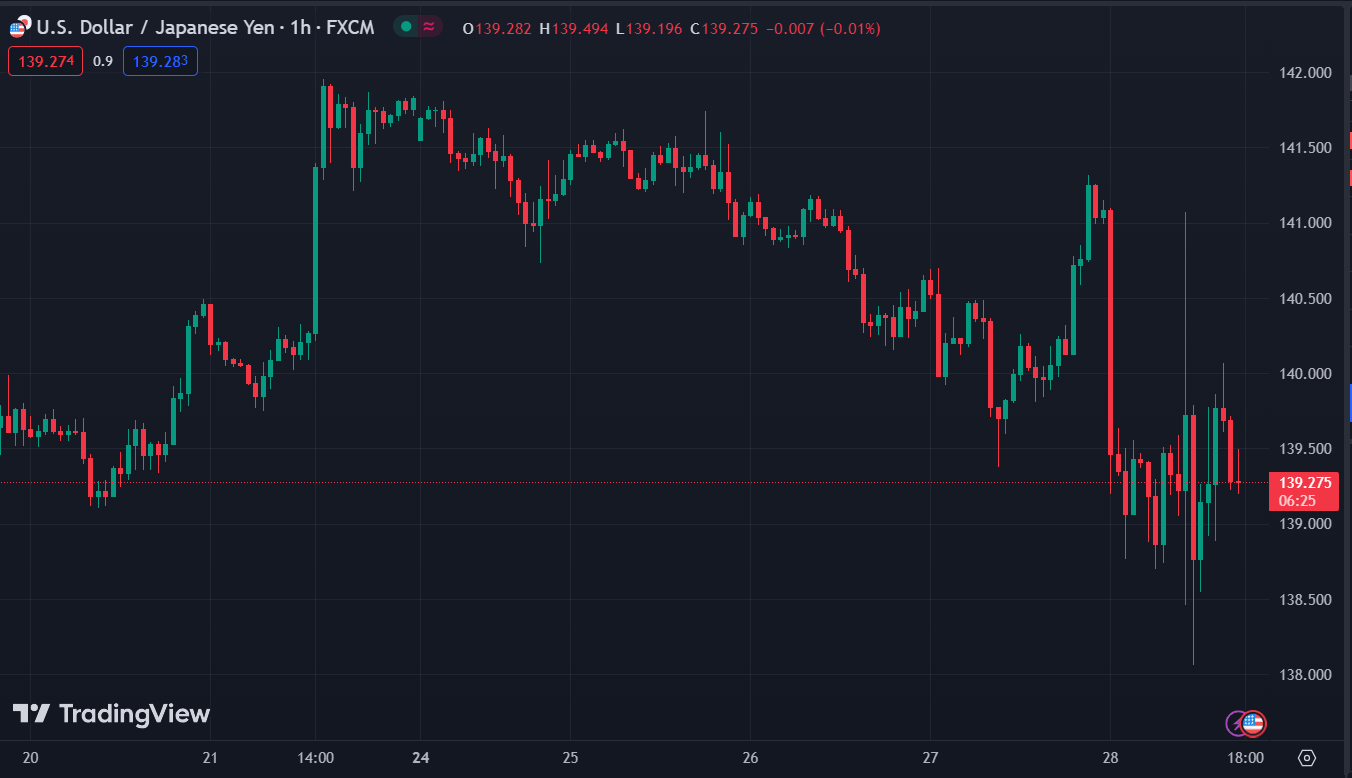 JPY biến động mạnh sau quyết định chính sách của BoJ. USDJPY tăng từ 139.15 lên 141.00 trước khi giảm về 138.05 rồi lại quay đầu tăng lên 140.00 và giảm trở lại mức 138.85 tại thời điểm hiện tại.