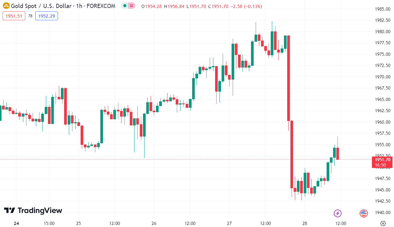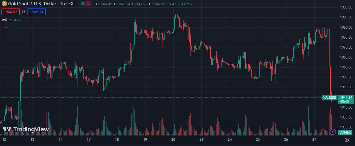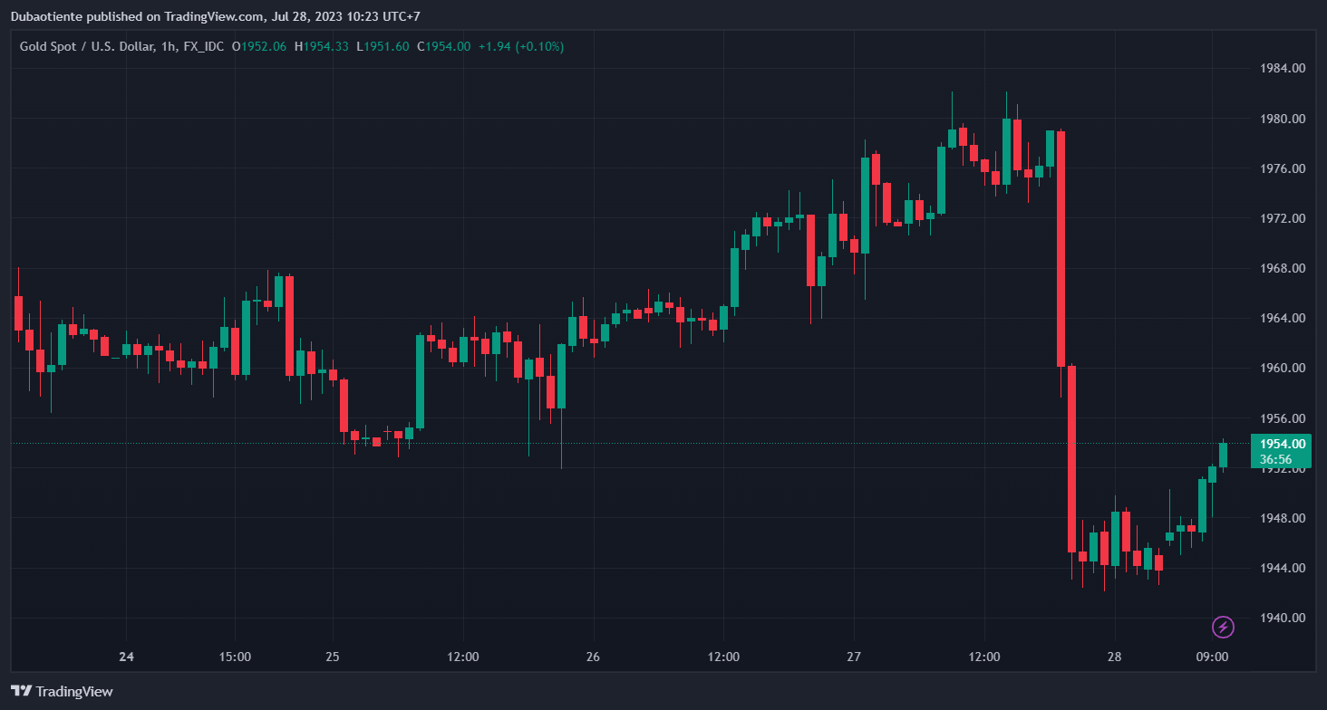 Vàng có một phiên giao dịch tồi tệ khi sập đến gần $35 xuống đáy ngày tại $1942/oz, do USD và lợi suất đảo chiều tăng đầu phiên Mỹ. Đây là phiên giảm sâu nhất của vàng trong khoảng 7 tuần trở lại đây. Chốt phiên, kim loại quý giảm gần $21 xuống $1950.30/oz. Trên thị trường trái phiếu, lợi suất 2 năm và 10 năm lần lượt tăng 7.7bp và 13.3bp lên 4.933% và 4%. Chỉ với 1 phiên tăng, lợi suất 10 năm đã thu hẹp phần lớn đà giảm được thiết lập 2 tuần trước đó.