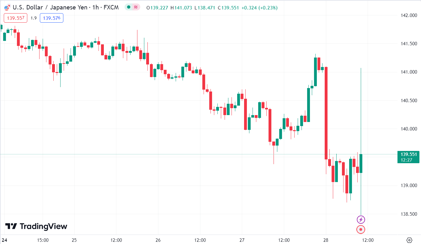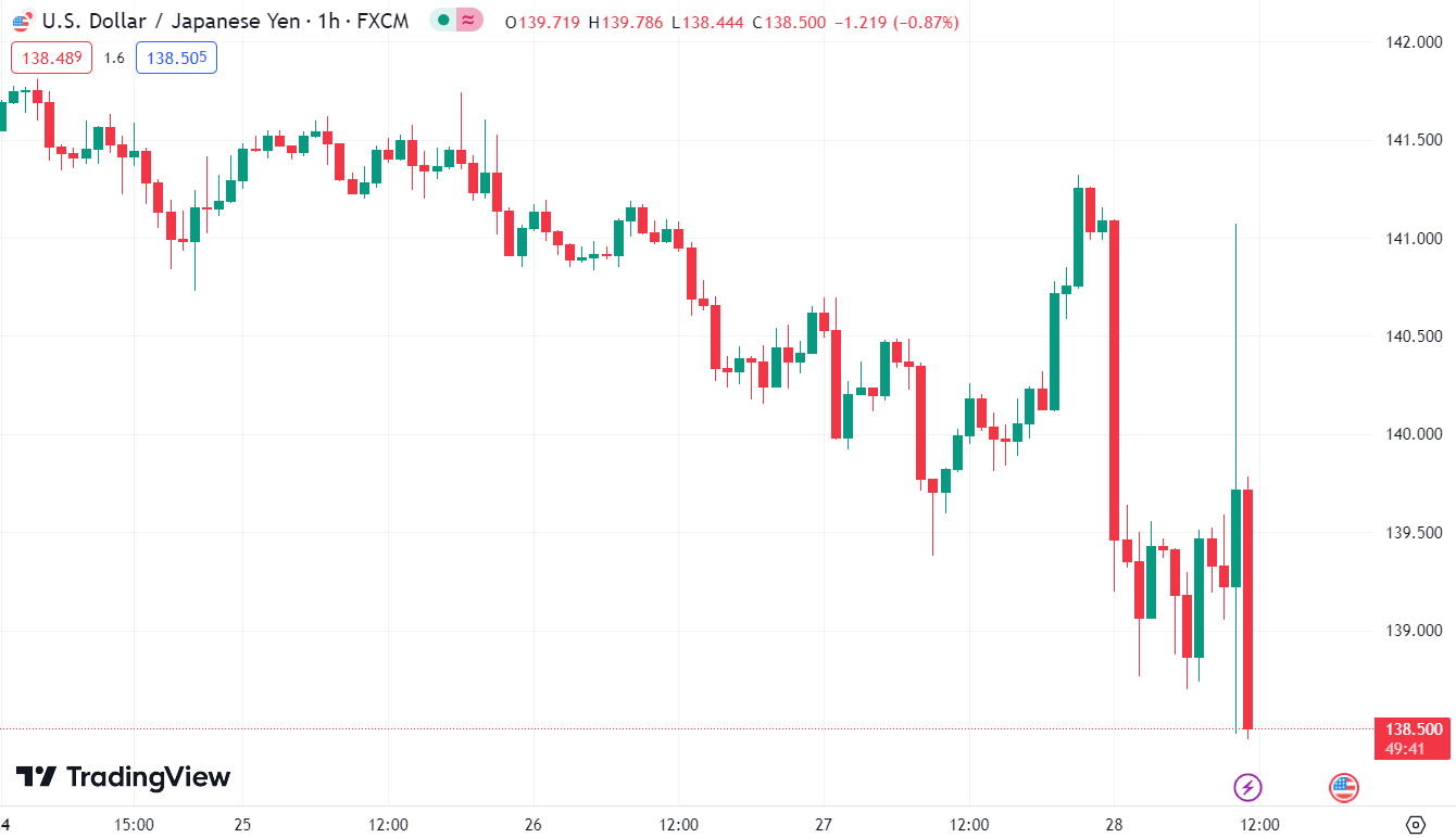 USD/JPY đã giảm mạnh từ đầu phiên châu Á (từ khoảng 139.50 xuống 138.90). Tuy nhiên, biến động giá không kết thúc ở đó, với mức thấp nhất trong phiên ở dưới 138.75 trước khi tăng trở lại 139.50.