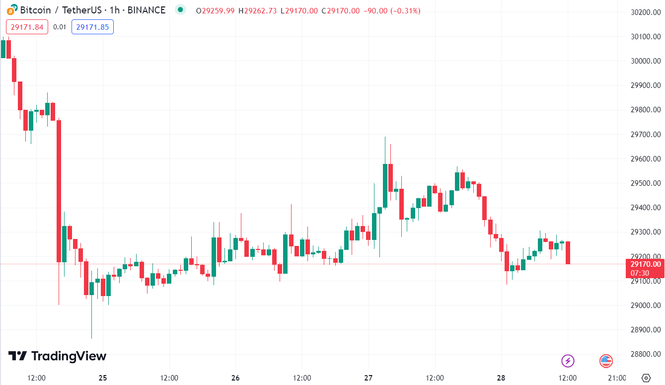 BTC giảm cùng chứng khoán Mỹ, sau khi chạm đỉnh ngày trên vùng 29.5K. Chốt phiên, BTC đóng cửa quanh ngưỡng 29.2K.