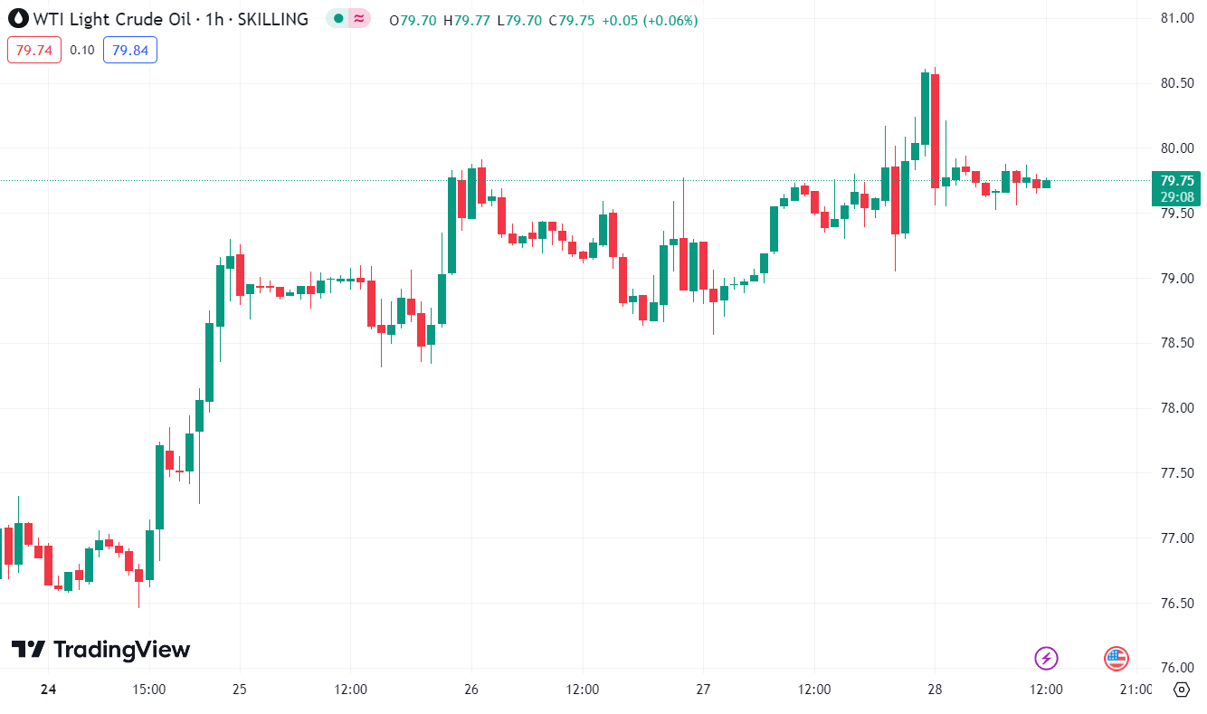 Dầu thô quay đầu giảm mạnh trong đêm sau khi chạm mốc $80.60/thùng được thiết lập đầu phiên Mỹ. Chốt phiên, dầu WTI tăng $1.31 lên gần $80.10/thùng. Giá năng lượng tăng mạnh làm dấy lên lo ngại rằng lạm phát lương thực sẽ khiến các tín hiệu hạ nhiệt lạm phát gần đây biến mất, do đây là nhân tố quan trọng góp phần làm CPI hàng năm giảm xuống.
