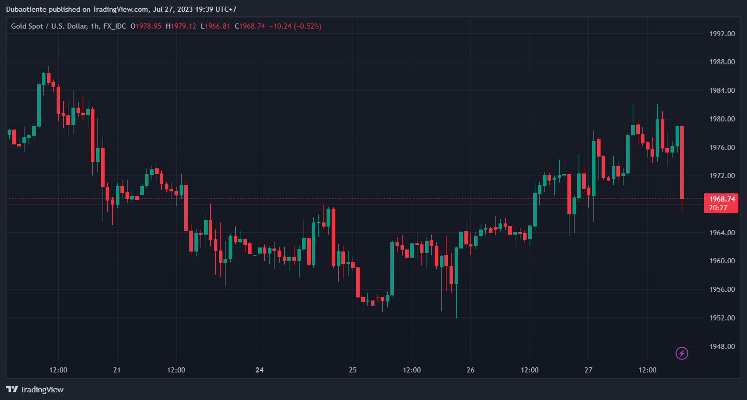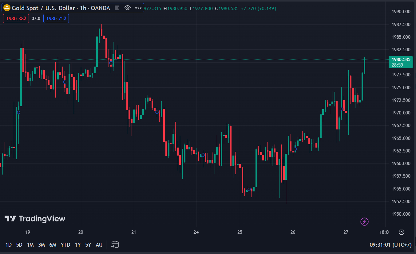 Kéo dài đà phục hồi từ sau quyết định lãi suất của Fed, vàng hiện tăng 0.42% trong ngày lên $1,980.48