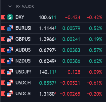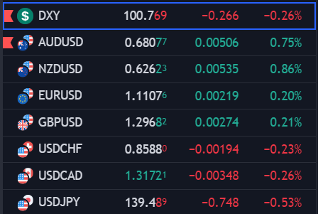 USD suy yếu trên diện rộng. NZD, AUD, EUR, GBP, CAD và CHF đều tăng so với bạc xanh. USDJPY giảm sâu, hiện giằng co quanh 139.70.