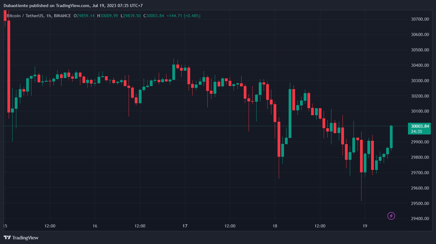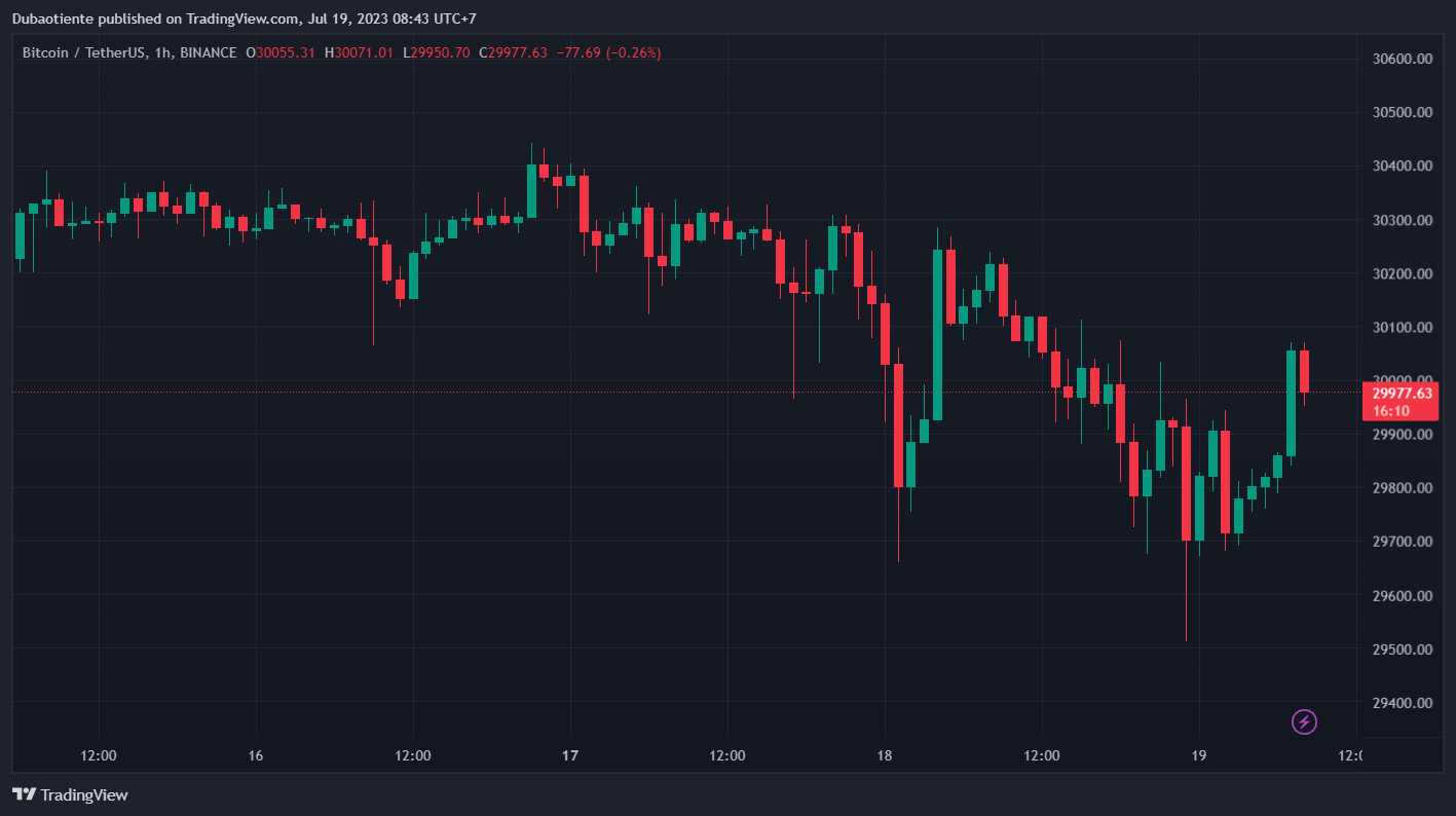 Bitcoin suy yếu phiên thứ 05 liên tiếp sau khi giảm dần từ đỉnh ngày tại 30.2K xuống 29.5K và sau đó hồi nhẹ lên quanh 29.8K