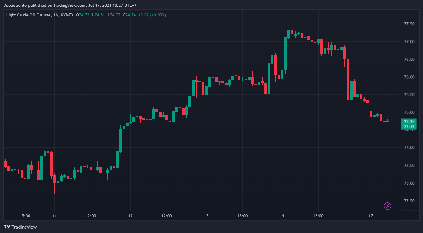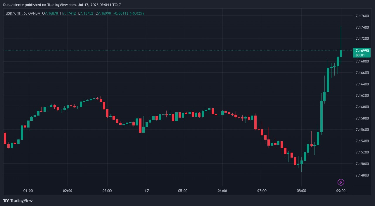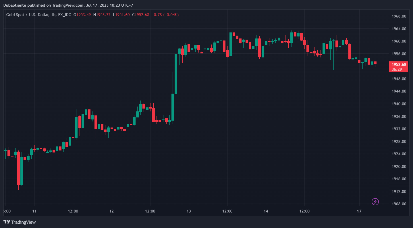 Trên thị trường FX, USD chững lại đà giảm sâu của 06 ngày trước đó sau báo cáo sơ bộ về tâm lý người tiêu dùng theo khảo sát từ Đại học Michigan mạnh mẽ vượt dự kiến (72.6 so với dự báo 65.5 điểm) trong tháng 7 tại Hoa Kỳ - mức cao nhất trong gần 2 năm trở lại đây. Đồng thời, kỳ vọng lạm phát trong năm tới ít thay đổi, tăng nhẹ từ 3.3% trong tháng 6 lên 3.4% trong tháng 7 và giảm từ mức cao 5.4% từ tháng 4 năm 2022. Chốt phiên, USD tăng trên diện rộng ngoại trừ với EUR (trở lại mức giá mở cửa trước đó). CAD dẫn đầu đà giảm trong ngày trước áp lực USD tăng và giá dầu giảm sâu.