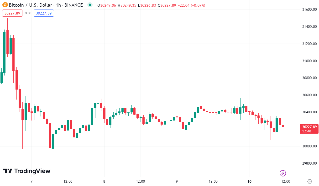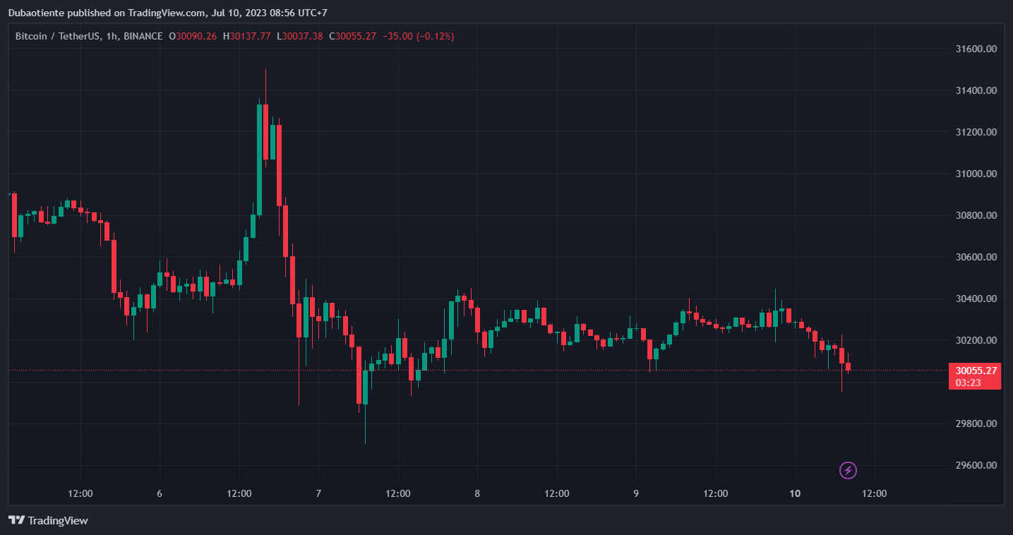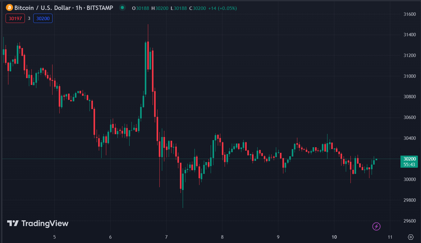 BTCUSD tăng 0.11% trong ngày, hiện dao động quanh $30,200