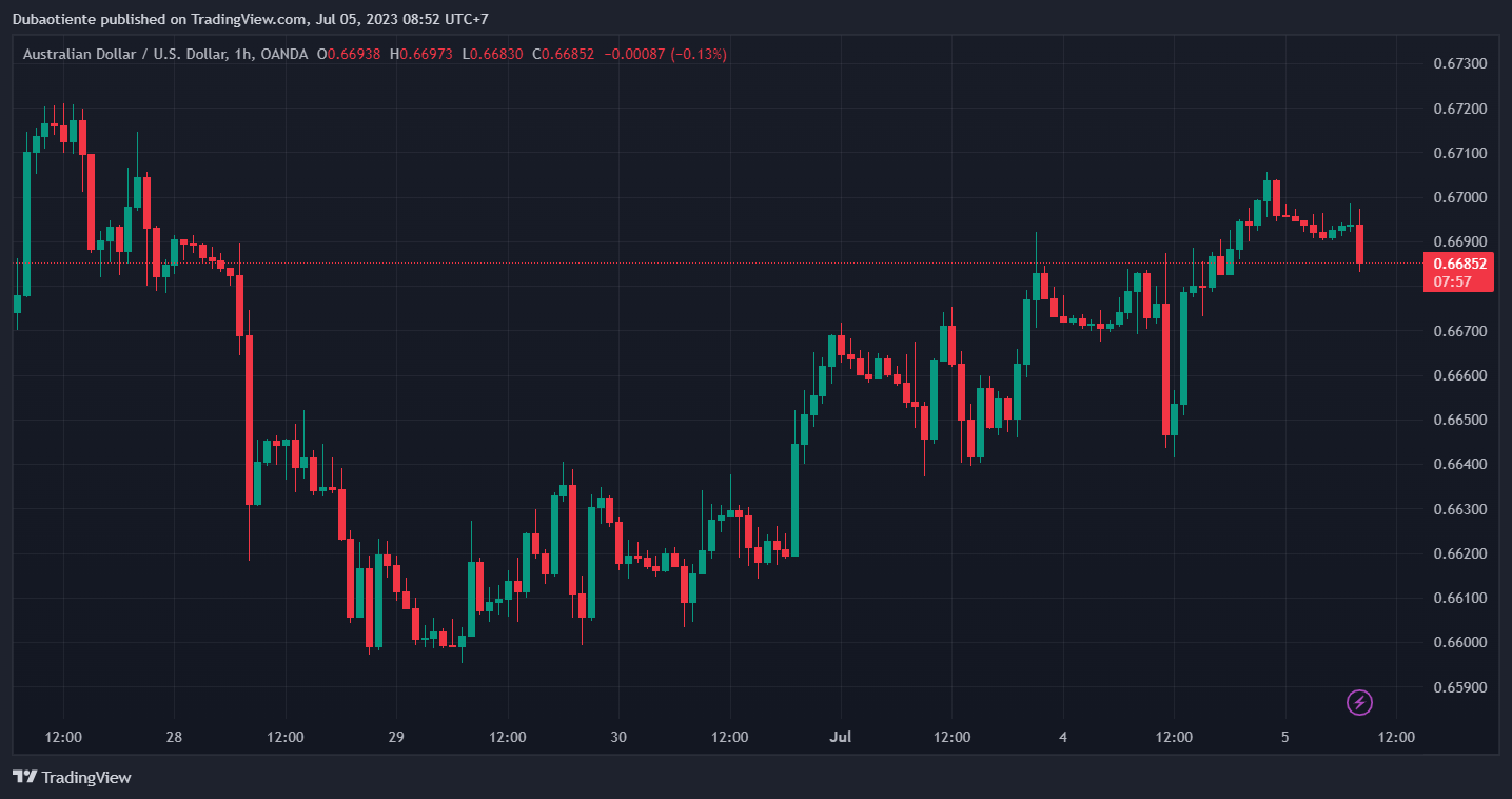 Trên thị trường FX, USD tăng nhẹ trên diện rộng, ngoại trừ với JPY và CAD sau khi giảm hơn 17 pip cuối phiên Á, trong bối cảnh Hoa Kỳ nghỉ lễ Độc Lập vào hôm thứ Ba. AUD phục hồi mạnh mẽ sau pha giảm sâu giữa phiên Á trước quyết định giữ nguyên lãi suất ở mức 4.10% của RBA trong tháng 7, để tiếp tục có thêm thời gian đánh giá tình hình và triển vọng kinh tế do độ trễ chính sách. RBA tin rằng lạm phát tại Úc đã qua đỉnh, tăng trưởng việc làm và nền kinh tế cũng đã giảm bớt nhưng vẫn sẽ tiếp tục tăng lãi suất nếu cần thiết để đưa lạm phát quay trở lại mục tiêu. Chốt phiên, AUD dẫn đầu đà tăng trong nhóm G7. JPY tăng nhẹ sau những nỗ lực lực can thiệp của Bộ Tài chính Nhật Bản nhưng không đáng kể.