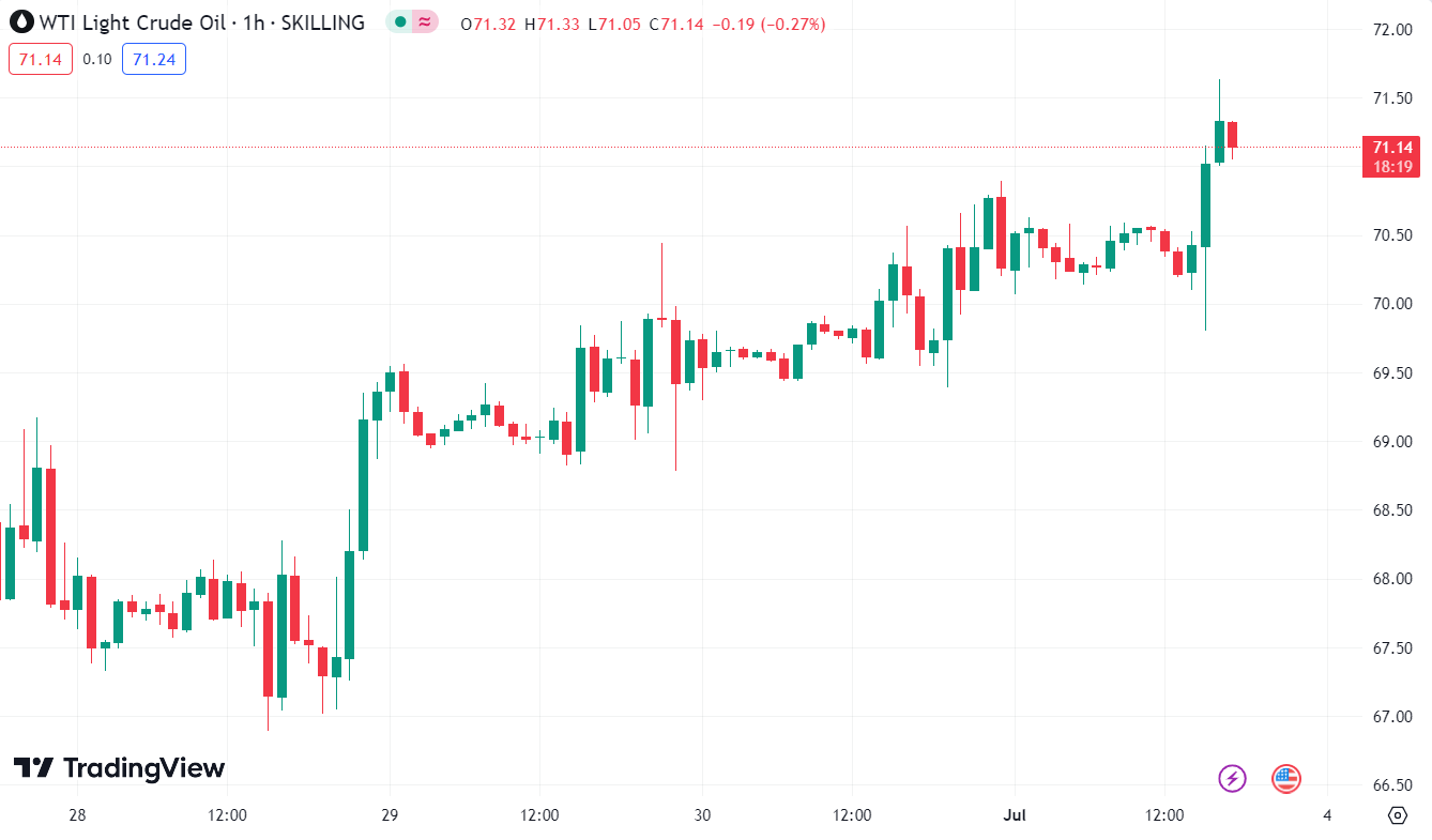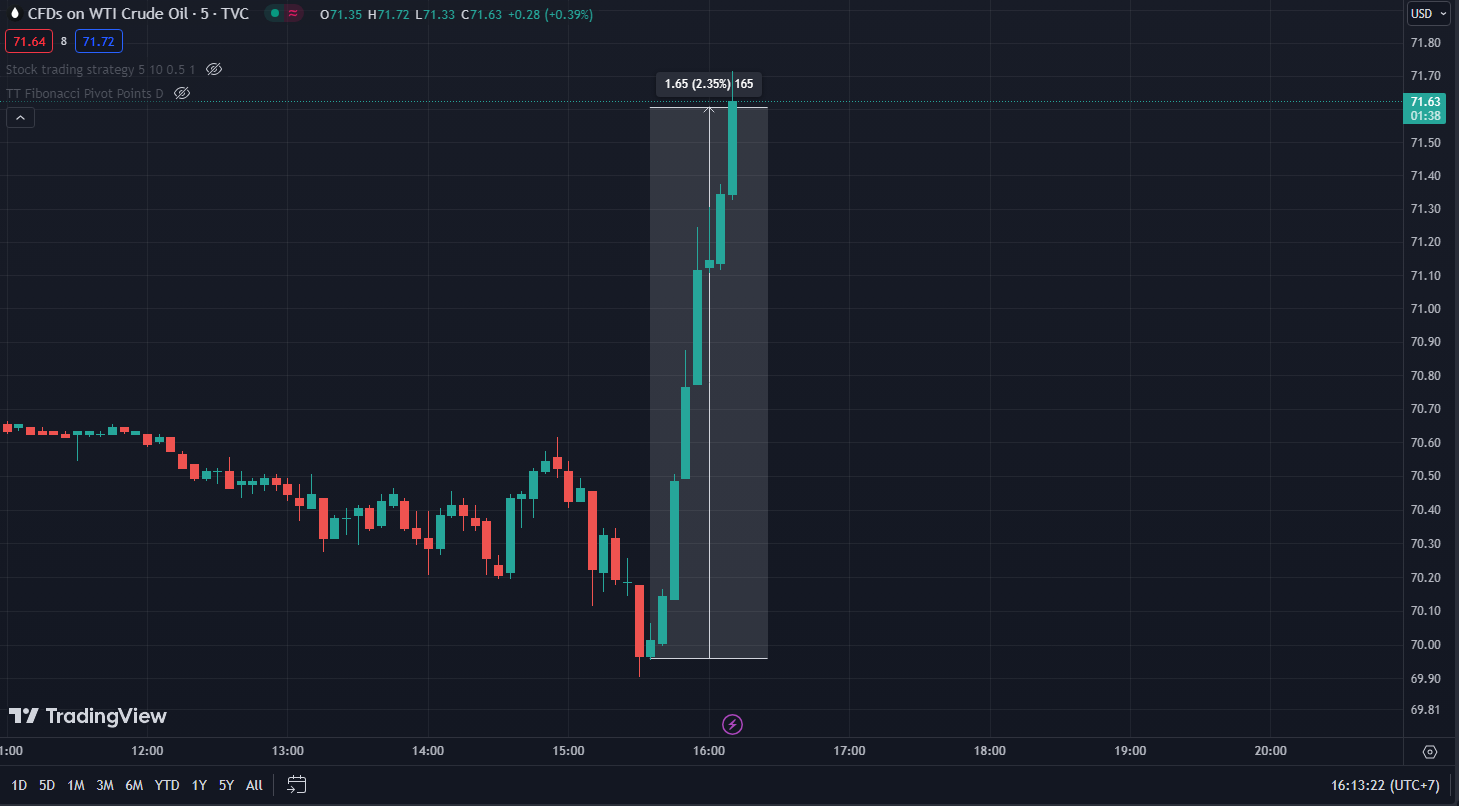 Giá dầu thô WTI bật tăng mạnh mẽ hơn 2% chỉ trong vòng vỏn vẹn 30 phút, hiện đang giao dịch ở mức $71.61/thùng