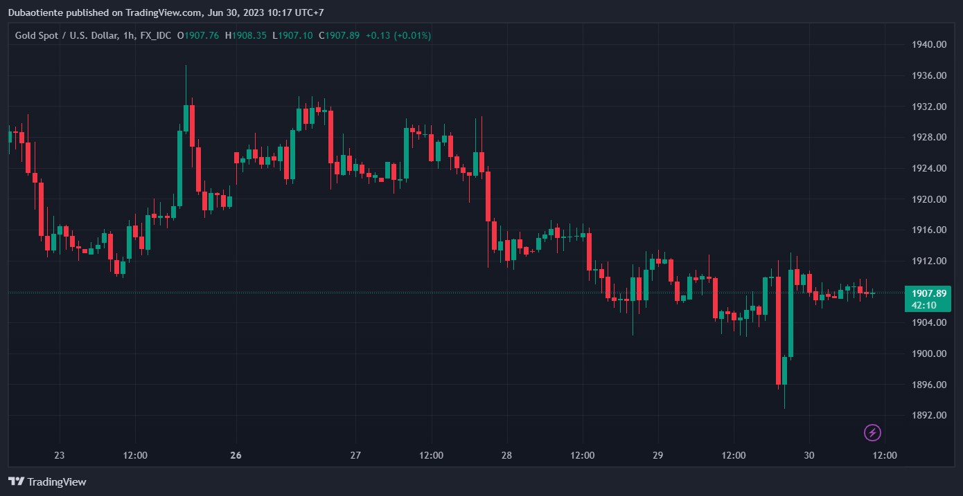Vàng nhanh chóng phục hồi mạnh mẽ nhờ dữ liệu doanh số bán nhà Hoa Kỳ vượt dự kiến, sau khi giảm mạnh xuống gần $1980/oz đầu phiên Mỹ do báo cáo GDP quý 1 ấn tượng và số đơn trợ cấp thất nghiệp thấp hơn kỳ vọng - do chịu áp lực tăng vọt của USD và lợi suất. Chốt phiên, vàng trở lại gần mức giá mở cửa trong ngày tại 1907.41/oz. Trên thị trường nợ, lợi suất 2 năm và 10 năm lần lượt +15.4bp và 13.2bp lên 4.866% và 3.842%, với phiên tăng mạnh thứ hai trong tháng 6. Dầu thô quét hai chiều sau các dữ liệu đầu phiên Mỹ và đóng cửa tăng $0.30 lên $69.86/thùng. BTC giảm xuống 30.2K trong đêm sau khi hồi trở lại lên 30.8K và tiếp tục đi ngang ở quanh vùng 30.5K.