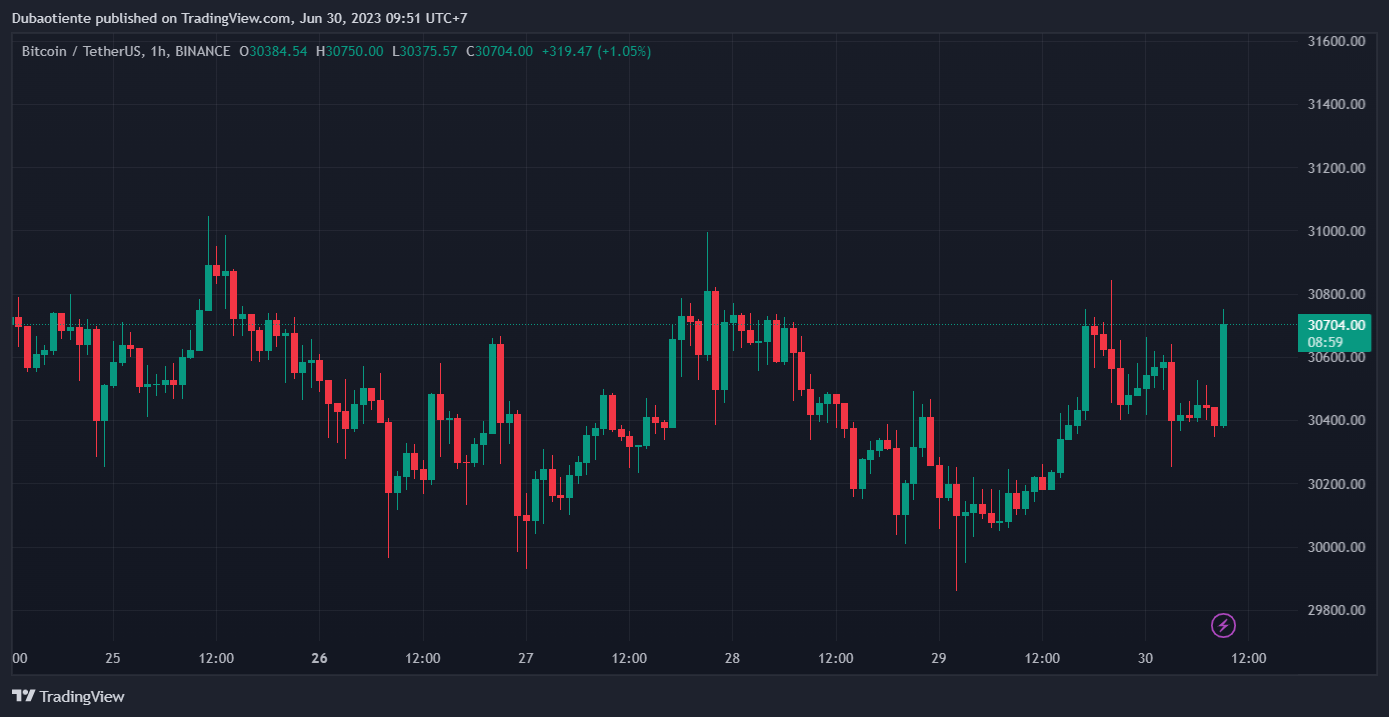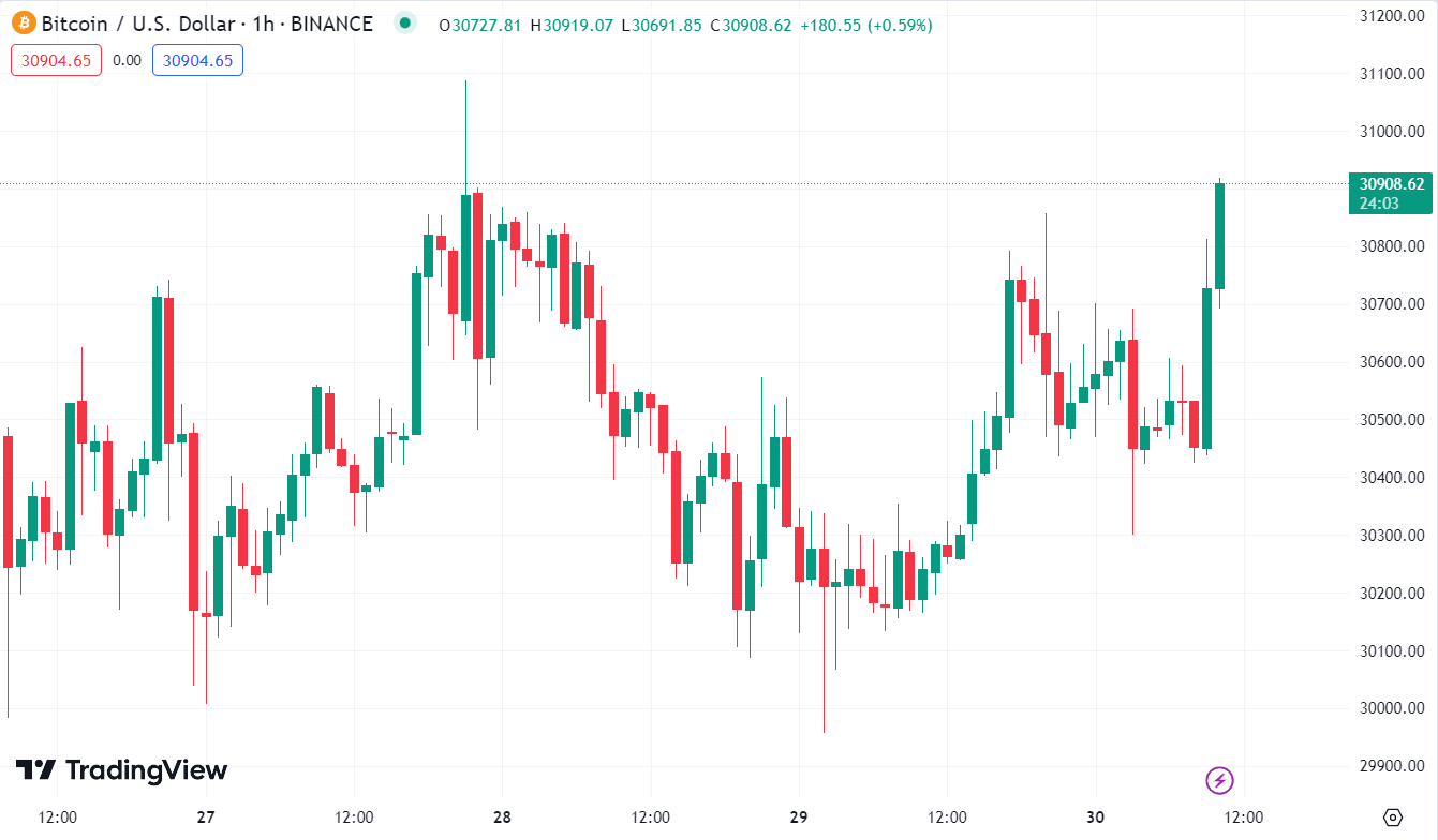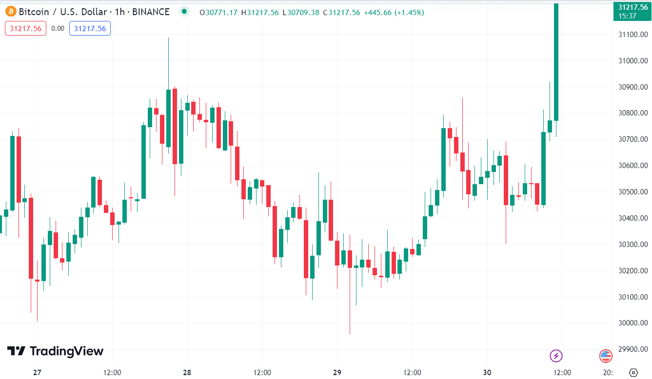 Bitcoin đã tăng vọt lên $31300 rồi ngay lập tức quay trở lại $30300 do gặp phải áp lực bán lớn. Tuy nhiên đồng tiền kĩ thuật số này đã tạo được động năng và chuẩn bị cán mốc $31000.