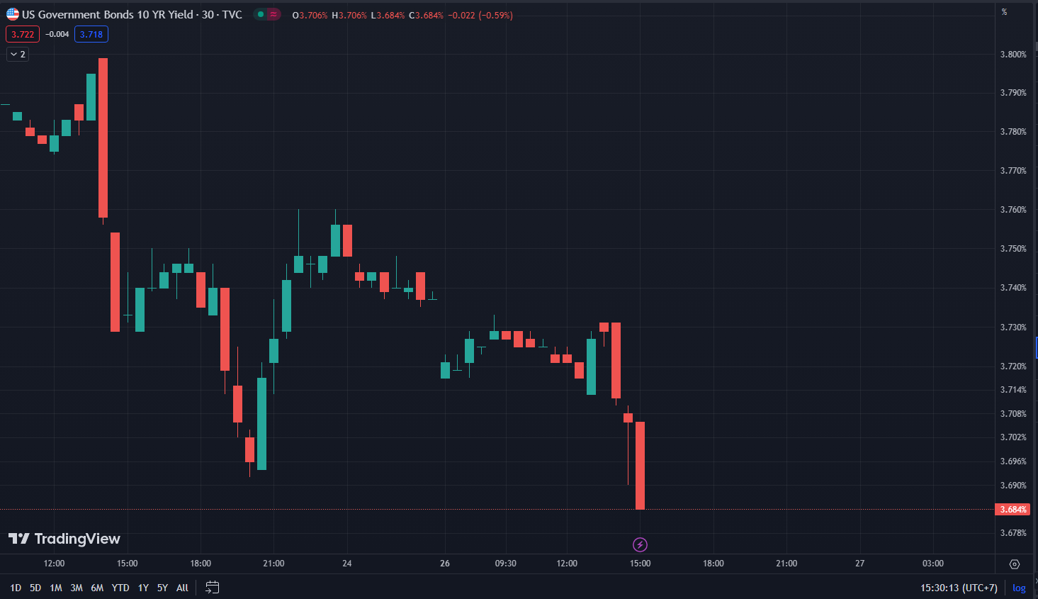Phiên giao dịch ngày hôm nay đã chứng kiến lợi suất trái phiếu chính phủ 10 năm Mỹ giảm 5.4bp xuống chỉ còn 3.684%. Nguyên nhân là do dòng tiền của các nhà đầu tư đang được rút khỏi cổ phiếu và đổ về trái phiếu khiến cho lợi suất giảm.