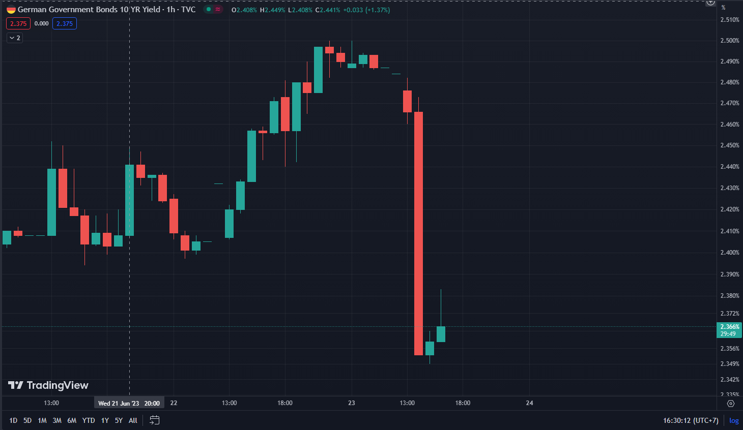 Khẩu vị rủi ro ảm đạm sau công bố bộ dữ liệu PMI khá đáng thất vọng từ Châu Âu. Hoạt động dịch vụ của Pháp đã giảm rõ rệt và cùng với những con số nhẹ nhàng hơn ở Đức đang khiến nền kinh tế khu vực đồng euro trì trệ vào cuối quý 2. Dữ liệu PMI đã làm dấy lên lo ngại về suy thoái kinh tế trong khu vực và kết quả là lợi suất giảm, với việc thị trường hoài nghi về việc ECB tăng lãi suất vào tháng 9.