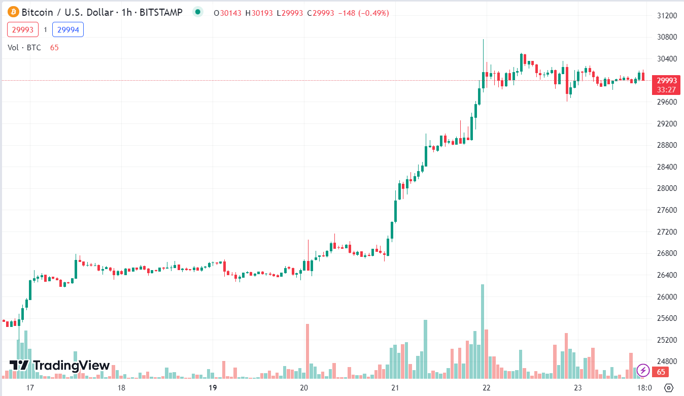 Bitcoin giảm 0.3% xuống còn 30,079 USD