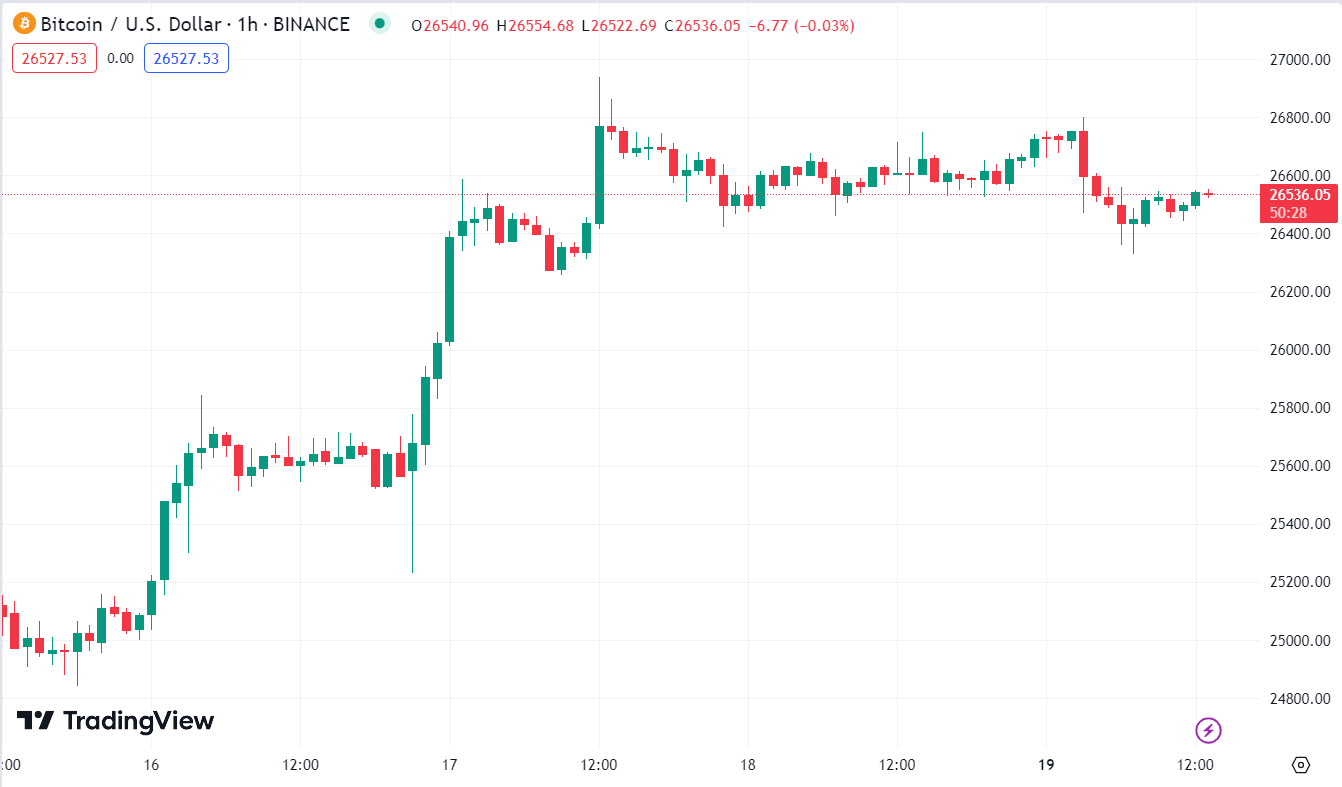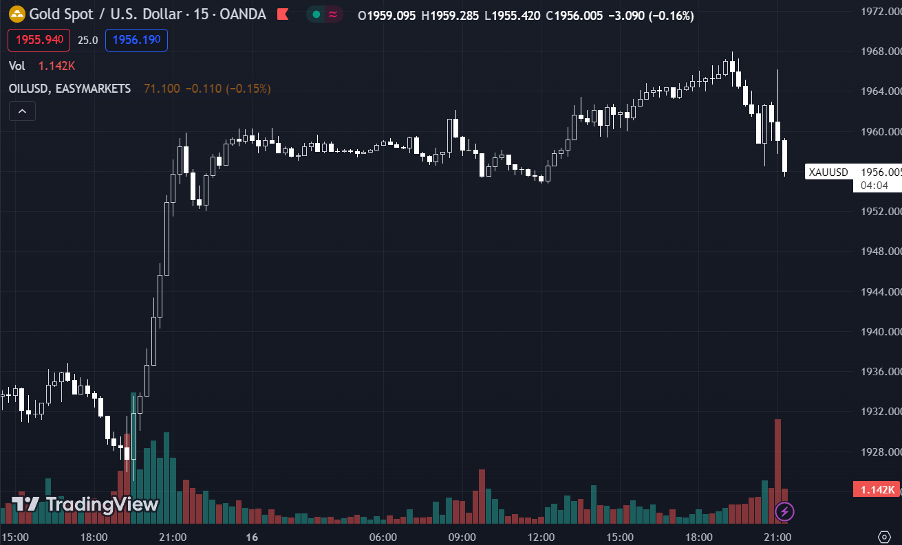 Lợi suất tăng đầu phiên Mỹ đã gây áp lực khiến vàng xóa sạch mức tăng trong ngày và kết phiên gần mức giá mở cửa tại $1957.3/oz. Mức cao nhất vàng đạt được trong ngày là $1967.89/oz. Trên thị trường nợ, lợi suất quét hai chiều sau dữ liệu tích cực từ đại học Michigan. Chốt phiên, lợi suất 2 năm và 10 năm lần lượt +6.8bp và -4.9bp lên 4.718% và gần 3.77%. Dầu thô nỗ lực phục hồi với phiên tăng thứ hai liên tiếp khi +$1.12 lên 71.93/thùng - gần mức đỉnh ngày. Bitcoin liên tục đi ngang quanh 26.5K trong hai ngày giao dịch cuối tuần sau khi vượt ngưỡng 26.8K vào trưa ngày thứ Bảy.