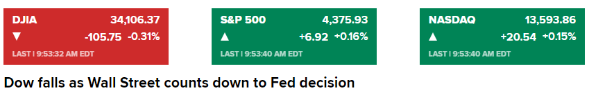 Chứng khoán Mỹ biến động trái chiều sau khi Fed tăng lãi suất đúng như kỳ vọng nhưng vẫn cố gây bất ngờ với dot plot 2023 tăng lên mức 4.6%, cao hơn 4.3% dự kiến. Phản ứng ban đầu của thị trường là giảm điểm trước dot plot và loạt dự báo hawkish của các quan chức, tuy nhiên đến buổi họp báo của chủ tịch Powell bắt đầu hồi phục lại khi ông rất mập mờ về chính sách. Đóng cửa phiên, Dow Jones giảm sâu nhất, S&P 500 và Nasdaq tăng khiêm tốn.