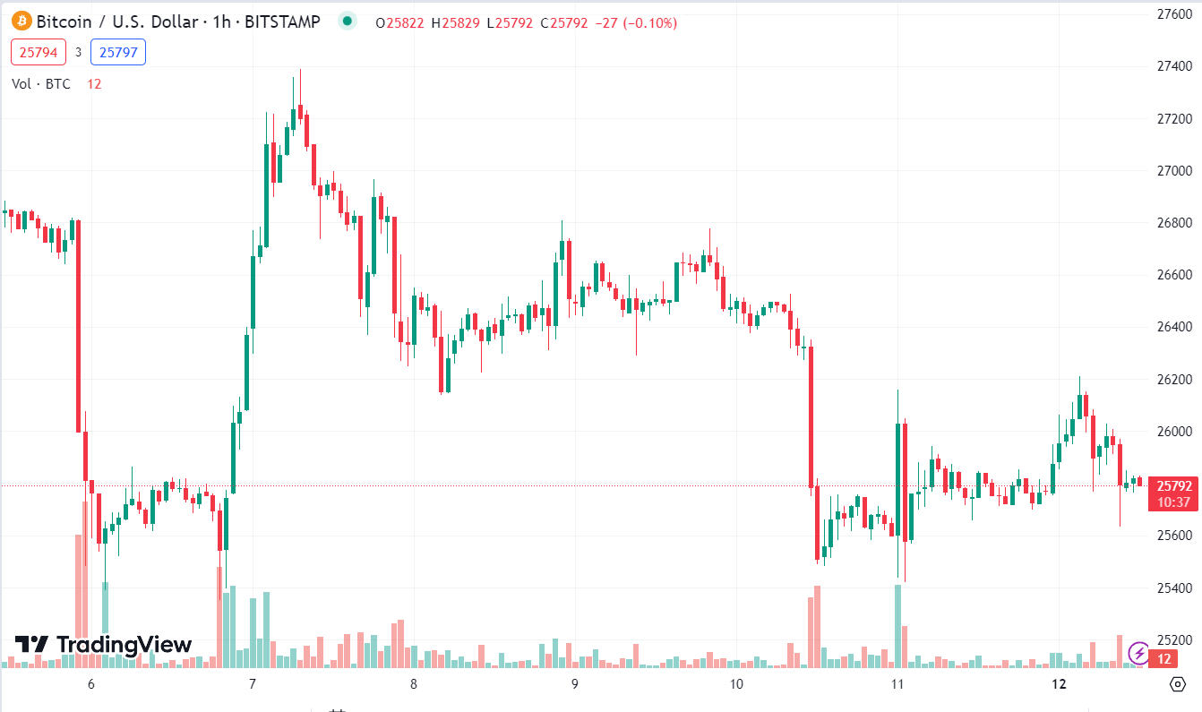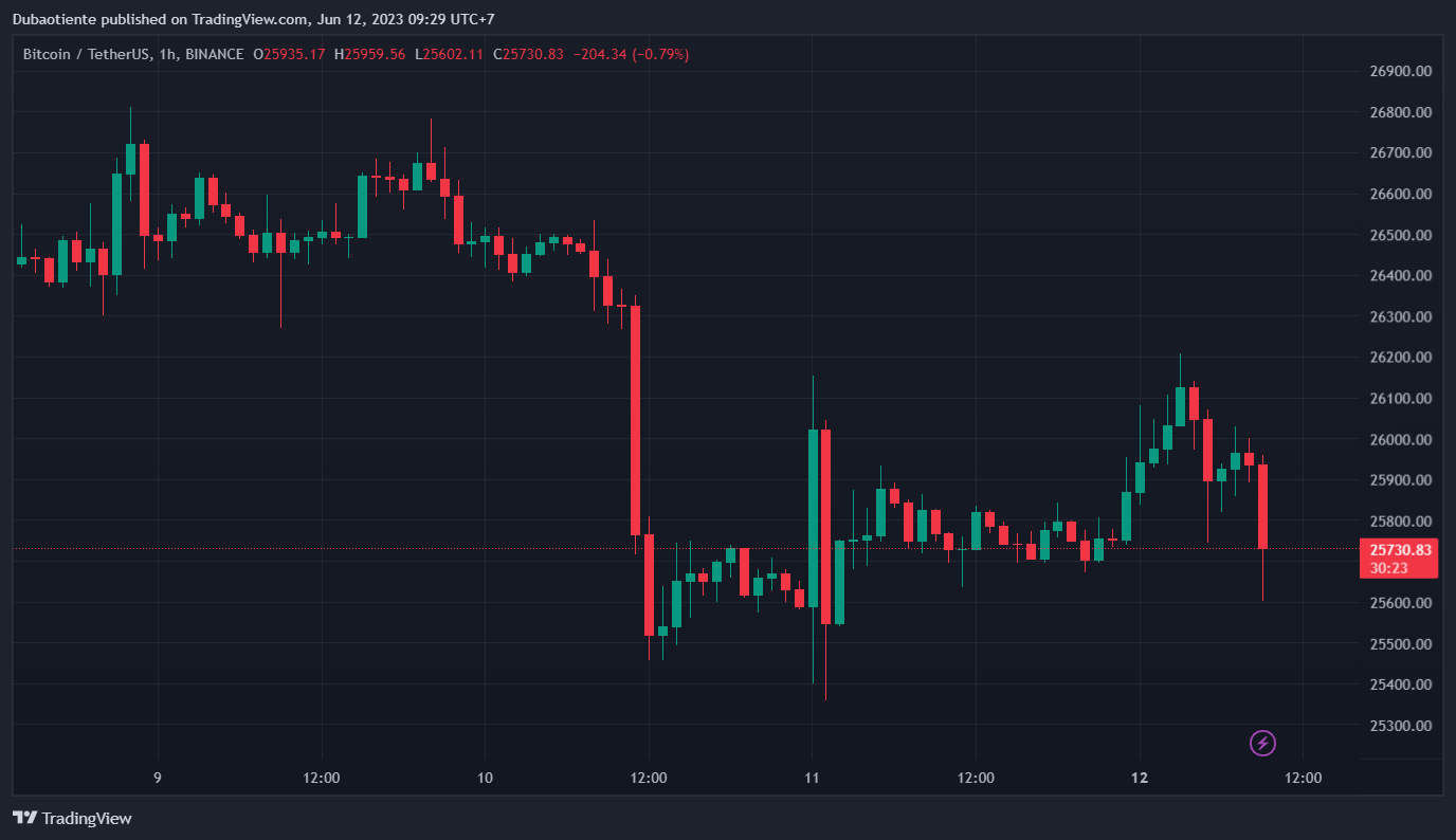 BTC hồi nhẹ lên 25.9K sau khi chạm mức thấp mới tại 25.3K được thiết lập vào hôm thứ Bảy.