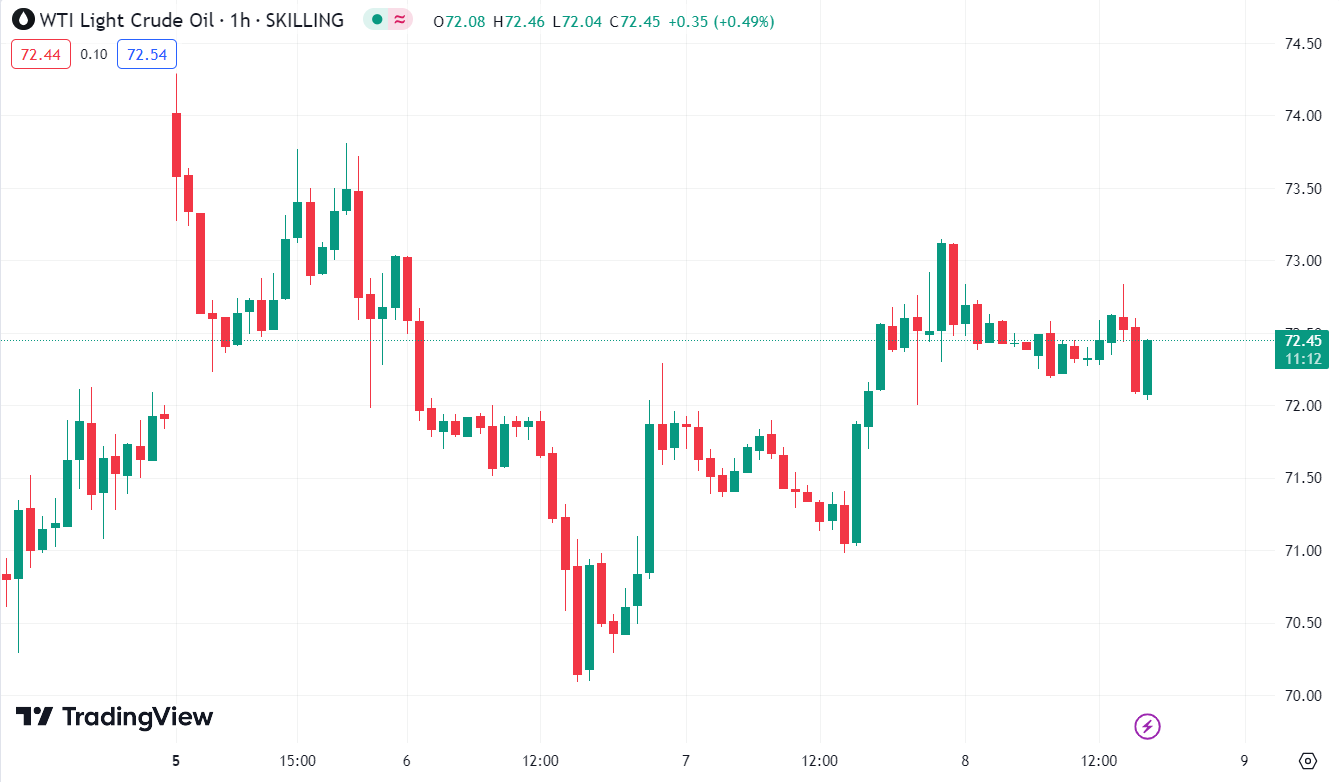 Dầu thô WTI đảo chiều tăng nhẹ trong phiên Âu, hiện đang giao dịch quanh mức $72.45/thùng.