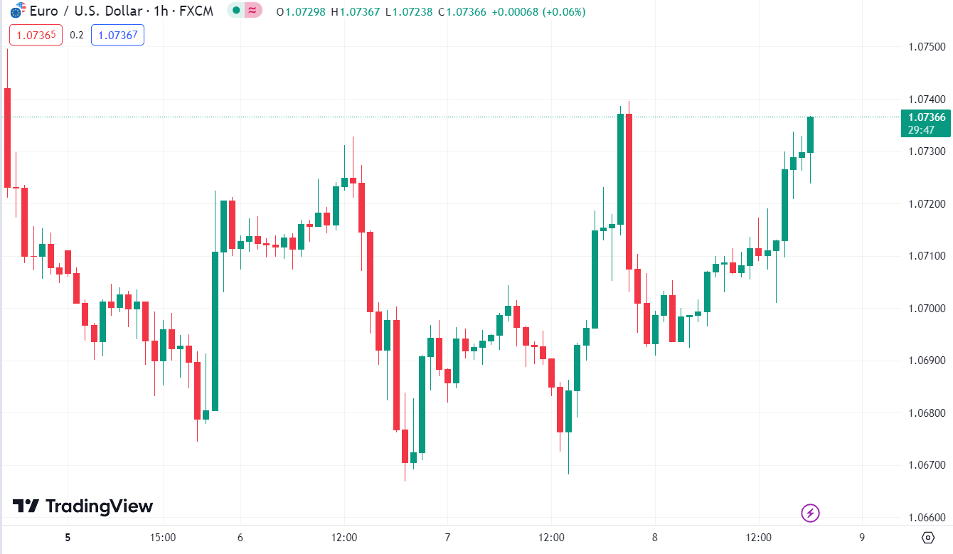 EURUSD tiếp tục tăng trong phiên Âu, hiện đang dao động quanh mức 1.07366.