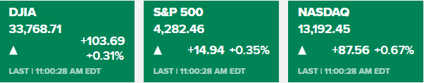 Sắc xanh bao trùm thị trường chứng khoán Hoa Kỳ trong bối cảnh cổ phiếu công nghệ phục hồi và lợi suất TPCP đồng loạt giảm, đặc biệt là lợi suất dài hạn bất chấp dấu hiệu hạ nhiệt nền kinh tế sau báo cáo thất nghiệp lần đầu vượt dự kiến trong tháng 5 tại Hoa Kỳ (+261K so với dự báo 236K). Chỉ số S&P 500 và Nasdaq tiếp tục duy trì ở mức cao trong năm, đặc biệt chỉ số S&P 500 đã xuất hiện dấu hiệu của một thị trường giá lên sau khi tăng khoảng 20% kể từ mức đáy trong tháng 10. Kết phiên: