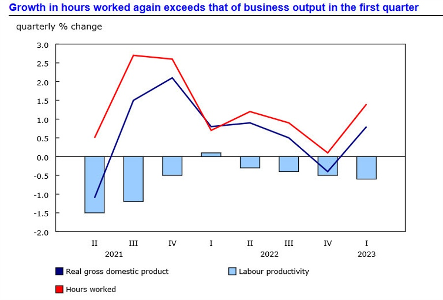 Nền kinh tế Canada mạnh hơn dự kiến trong quý đầu tiên của năm 2023, với mức tăng trưởng GDP là 3.1%. Tăng trưởng tiêu dùng mạnh mẽ và trên diện rộng một cách đáng ngạc nhiên, ngay cả sau khi tính đến sự gia tăng dân số. Nhu cầu về dịch vụ tiếp tục tăng trở lại. Ngoài ra, chi tiêu cho hàng hóa và hoạt động thị trường nhà ở đã tăng lên. Thị trường lao động vẫn còn chặt chẽ: tỷ lệ nhập cư và tham gia lao động cao hơn đang mở rộng nguồn cung lao động nhưng lao động mới đã nhanh chóng được tuyển dụng, phản ánh nhu cầu lao động tiếp tục mạnh mẽ. Nhìn chung, nhu cầu dư thừa trong nền kinh tế dường như dai dẳng hơn dự đoán.