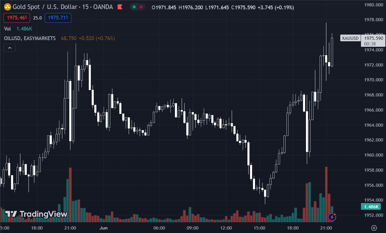 USD và lợi suất đồng loạt giảm tiếp tục hỗ trợ vàng tăng chốt phiên tăng gần $14 lên $1976.69/oz. Cụ thể, lợi suất 2 năm và 10 năm lần lượt -6.27bp và -4.7bp xuống 4.345% và gần 3.6%. Dầu thô tăng mạnh mẽ lên hơn $70.10 (tăng hơn $2 so với giá mở cửa) sau khi chạm $71/thùng giữa phiên Mỹ.