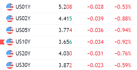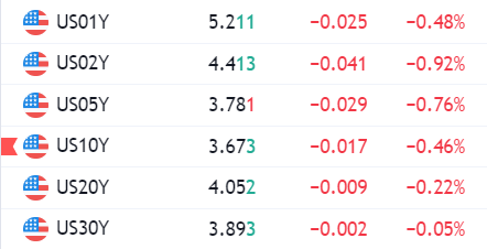 Lợi suất đồng loạt giảm đã hỗ trợ vàng tăng hơn $20 lên gần $1975/oz. Chốt phiên, kim loại quý tăng $3.28 lên $1962.73/oz. Lợi suất 2 năm và 10 năm lần lượt -4.7bp và -4.4bp xuống 4.407% và 3.646%. Giá dầu thô hồi nhẹ lên hơn $68 (giảm $1.73 so với giá mở cửa) sau khi giảm sâu xuống gần $67/thùng trong phiên Mỹ.