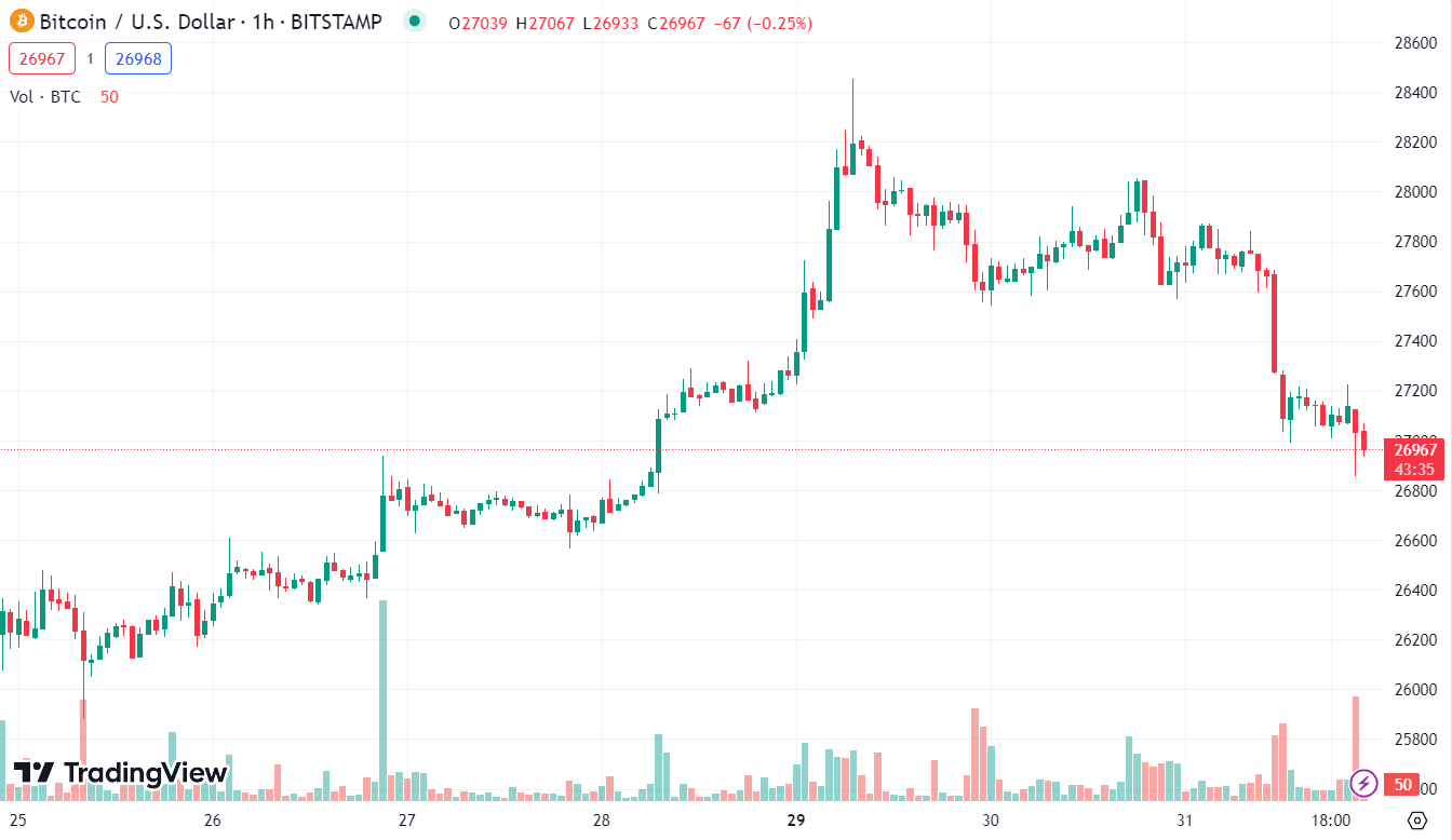 BTCUSD giảm 2.67% trong ngày xuống $26,964