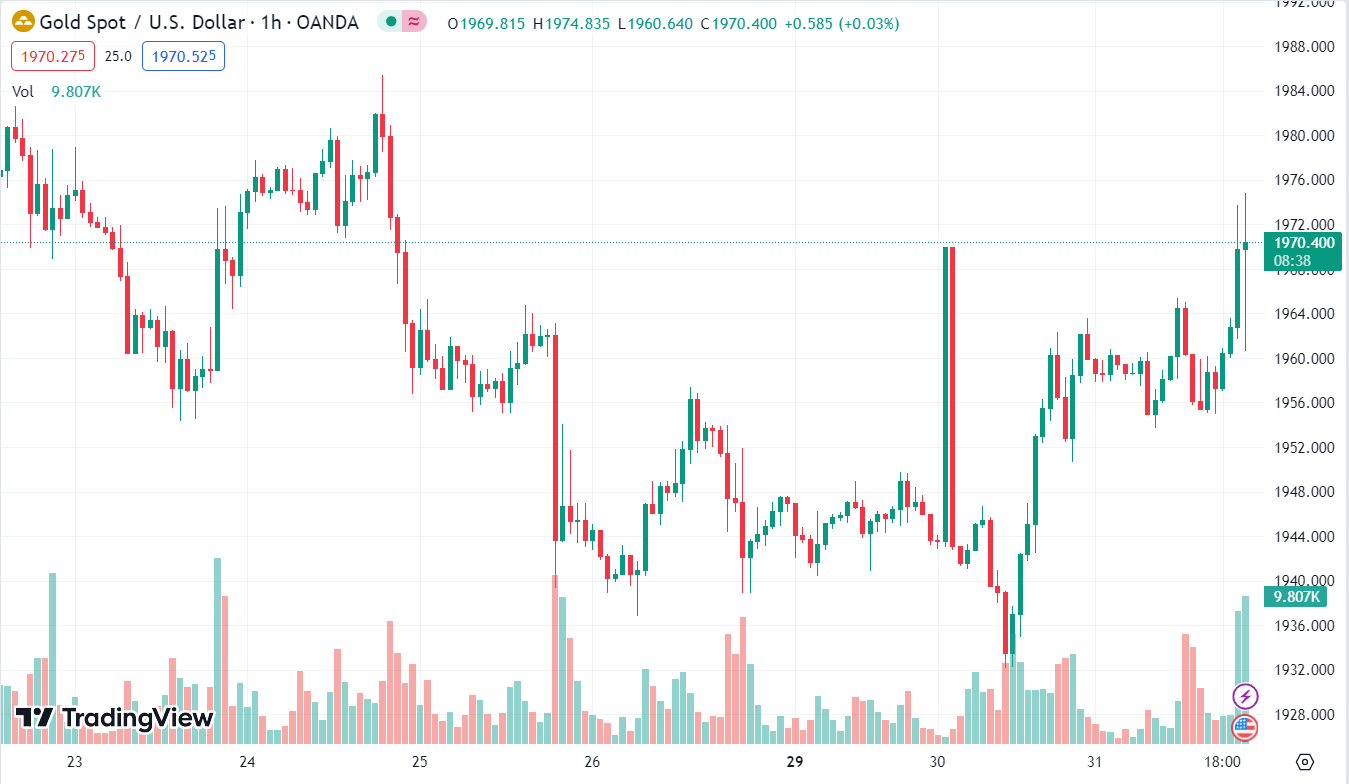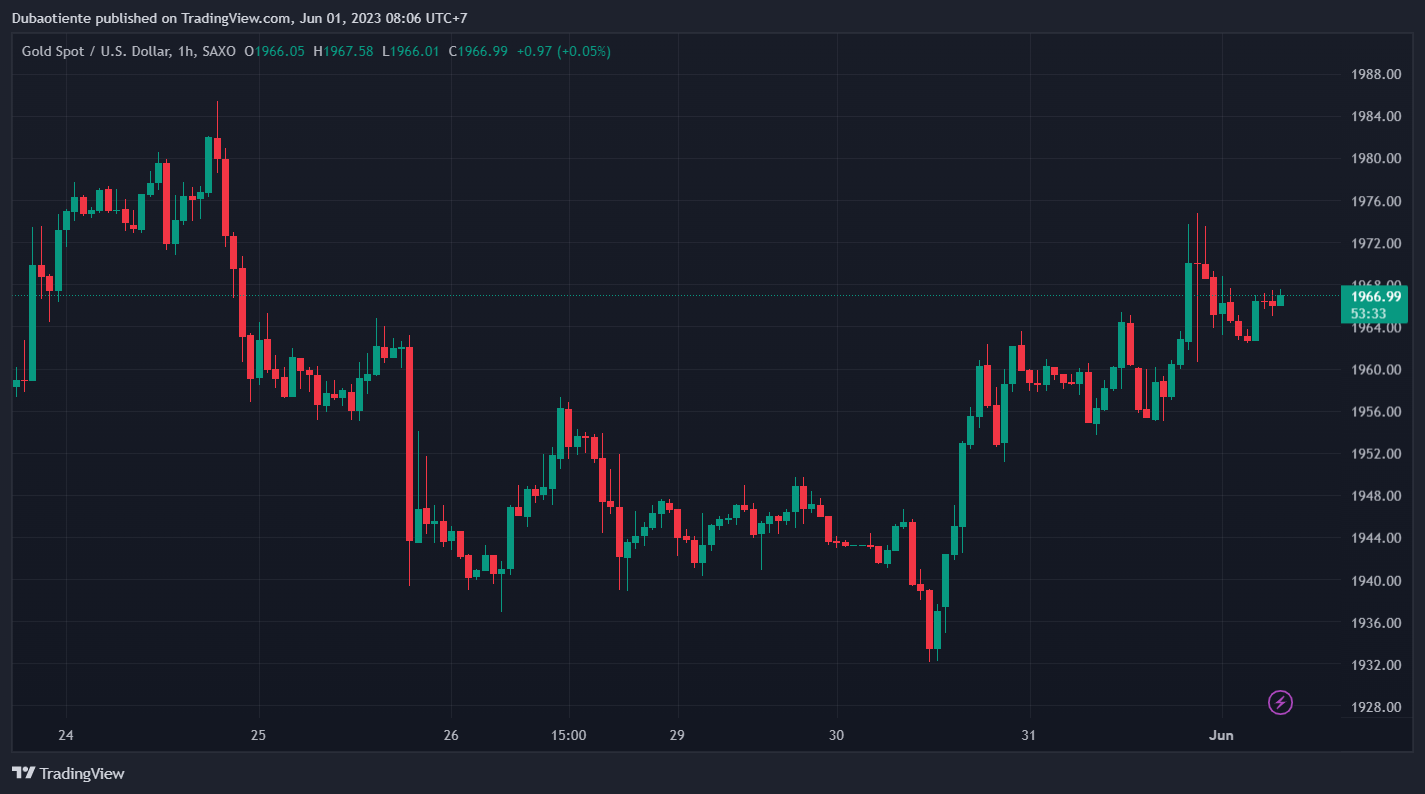 XAUUSD hiện tăng 0.55% trong ngày lên $1,970.40