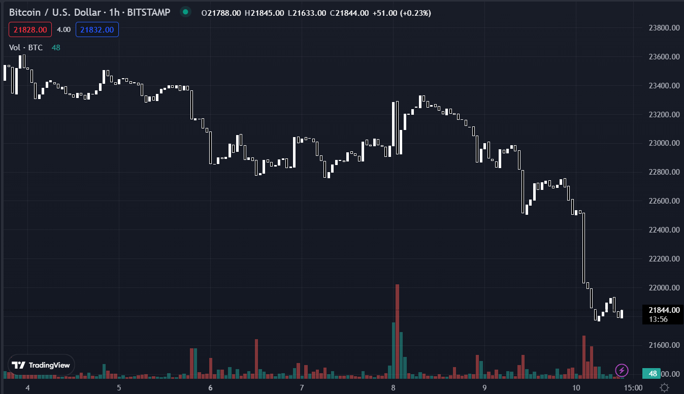 BTC đi ngang sau khi giảm mạnh, hiện đang giao động trên mức $21,800.