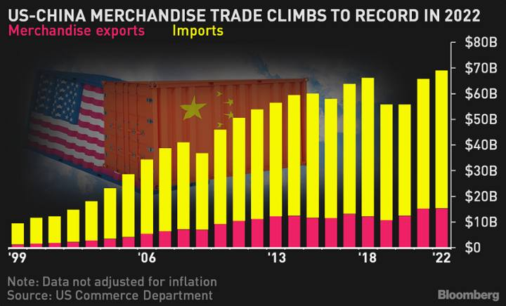 Giao dịch hàng hóa giữa Hoa Kỳ và Trung Quốc đã tăng lên mức kỉ lục trong năm 2022. Bộ thơpng mại Hoa Kỳ đã nhắc nhpr rằng những người tiêu dùng và các công ty ở hai cường quốc lớn nhất thé giới vẫn có mối liên hệ chặt chẽ với nhau. Tổng giá trị hàng hóa giữa hai nước tăng lên 690.6 tỷ đô