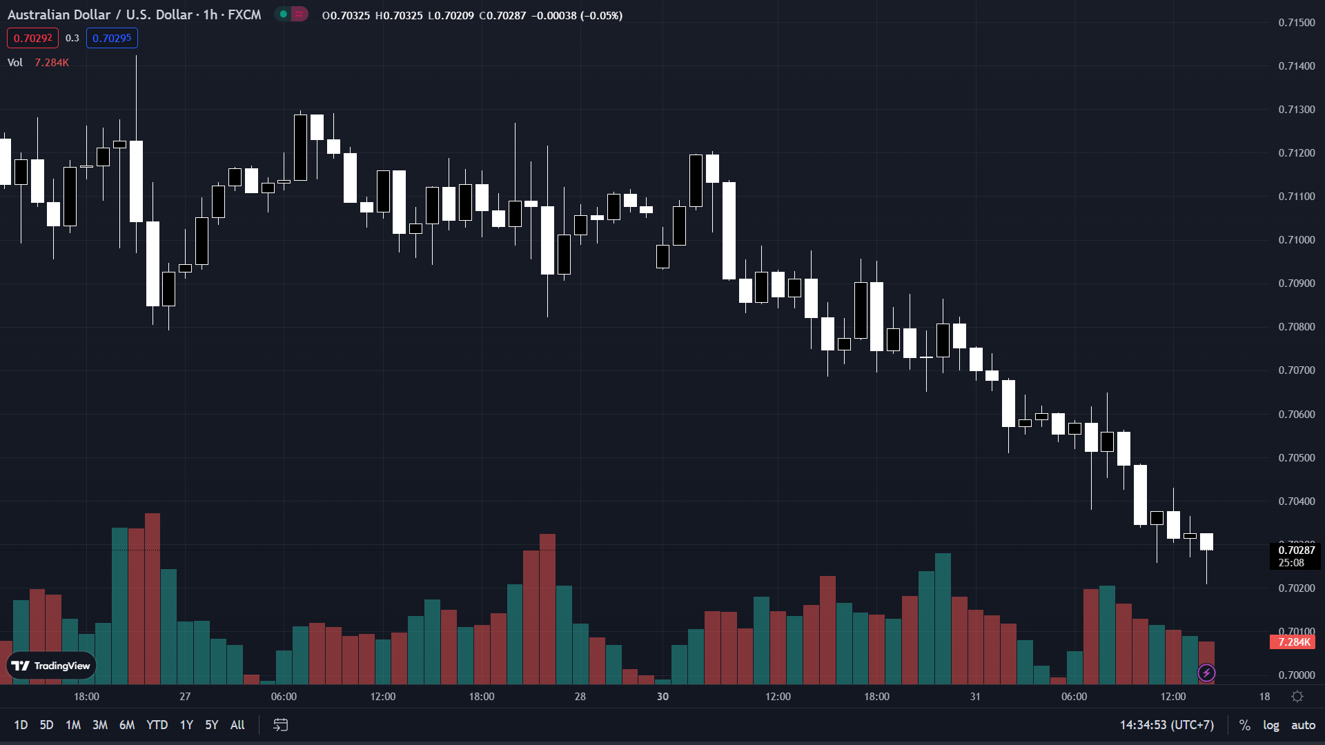 AUD/USD giảm 0.45% xuống dưới 0.7030 trong ngày. Tỷ giá này hiện đang ở mức 0.70287.
