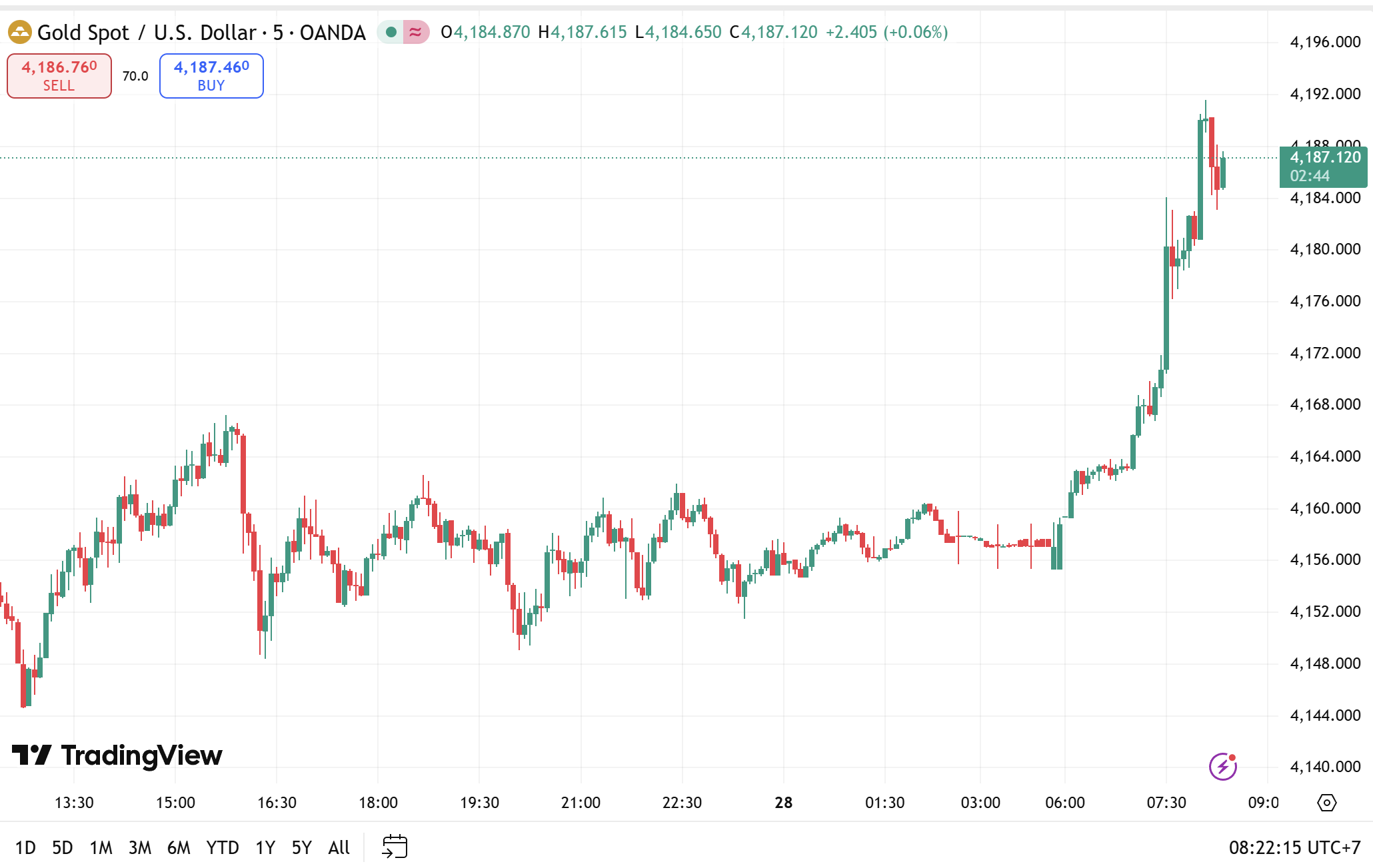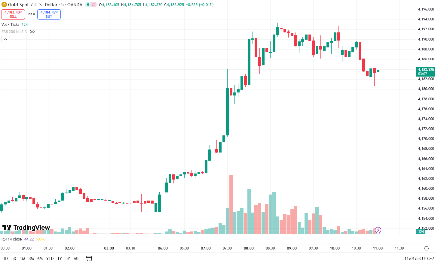 Vàng tiếp tục duy trì trong mô hình cờ kỹ thuật, với mức giá chạm đỉnh $4,173 trước khi giảm nhẹ về $4,157 trong ngày.