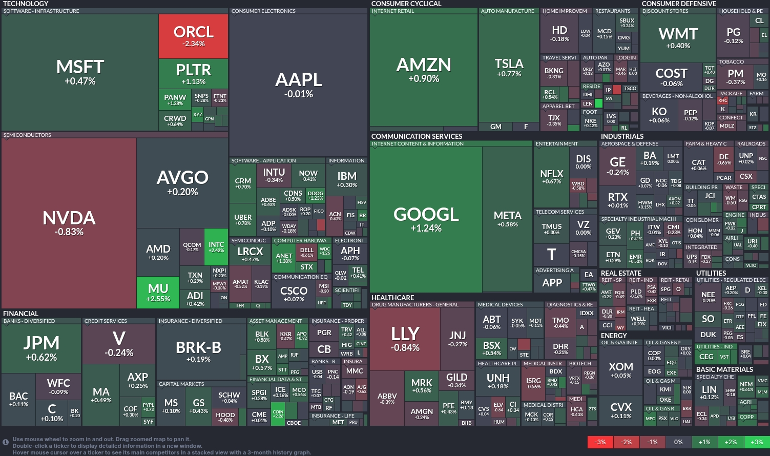 Oracle (ORCL) giảm: Bất chấp xu hướng tích cực của ngành công nghệ, Oracle giảm 2.34%, có thể do chốt lời hoặc tác động từ các tin tức riêng của ngành.