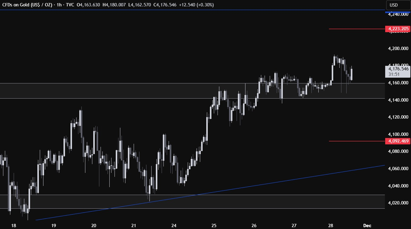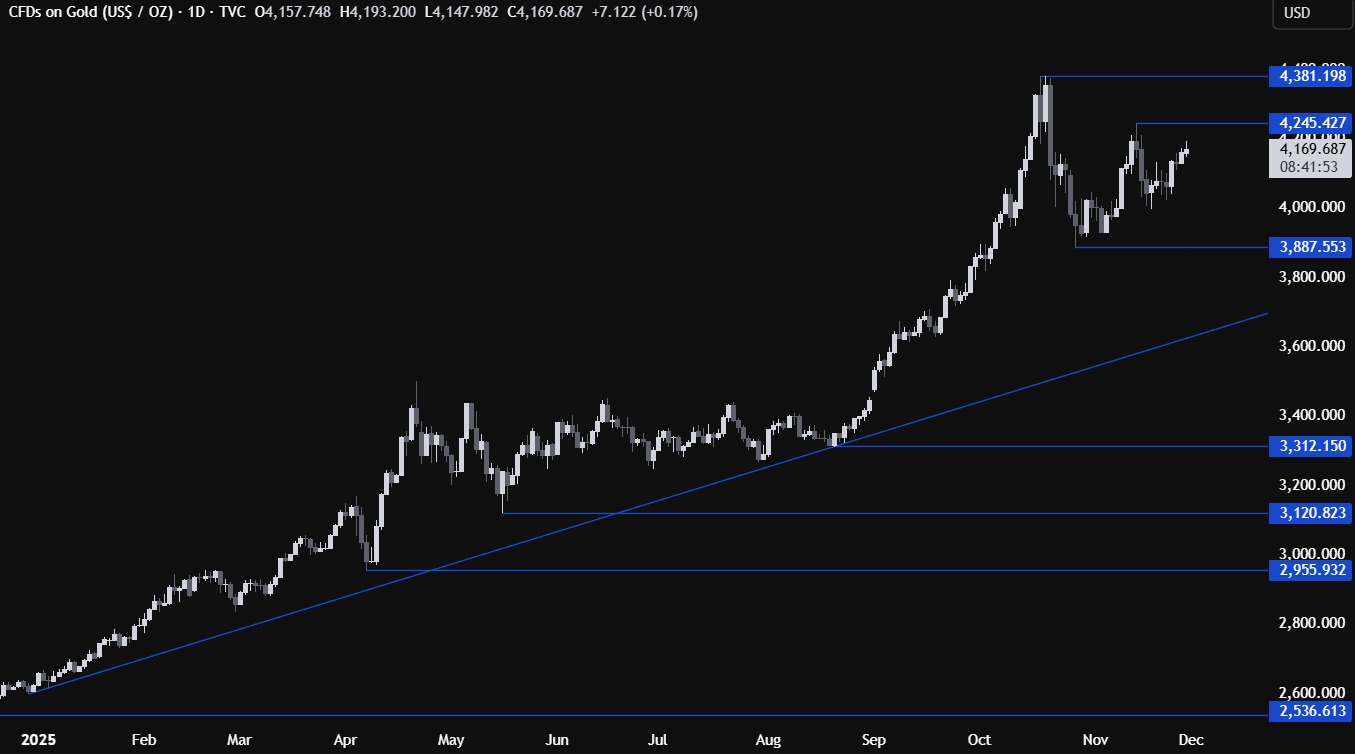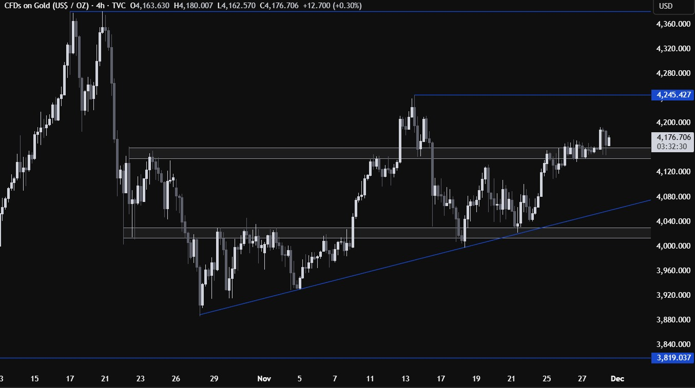 Giới phân tích cho rằng, một cú phá vỡ trên mức $4,200 có thể mở đường cho vàng hướng tới các đỉnh cao nhất trong năm, nhờ động lực mùa vụ thường tích cực vào tháng 12 và tháng 1.