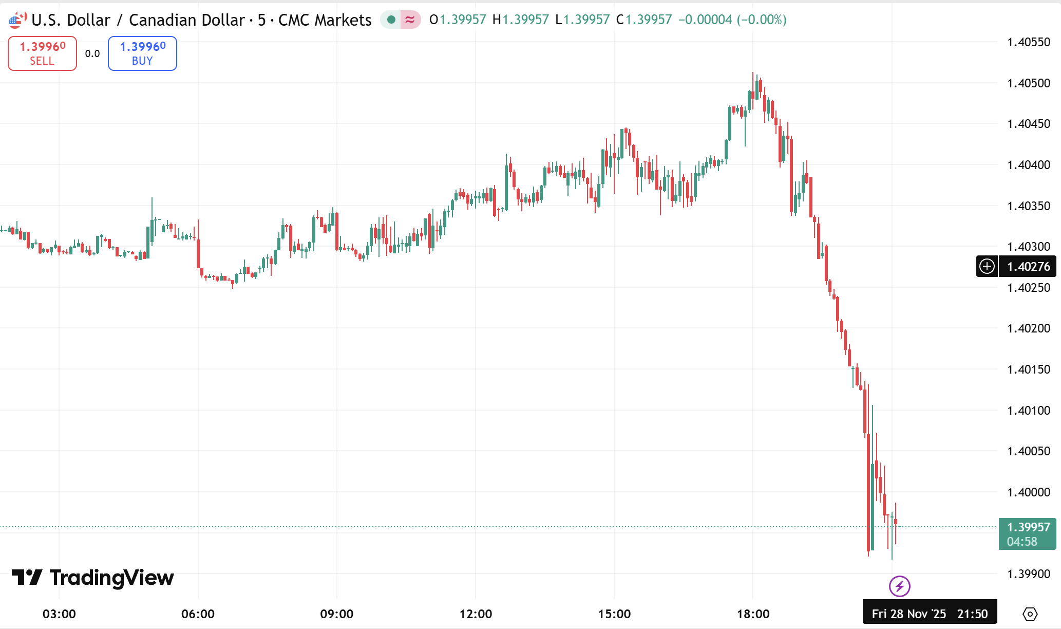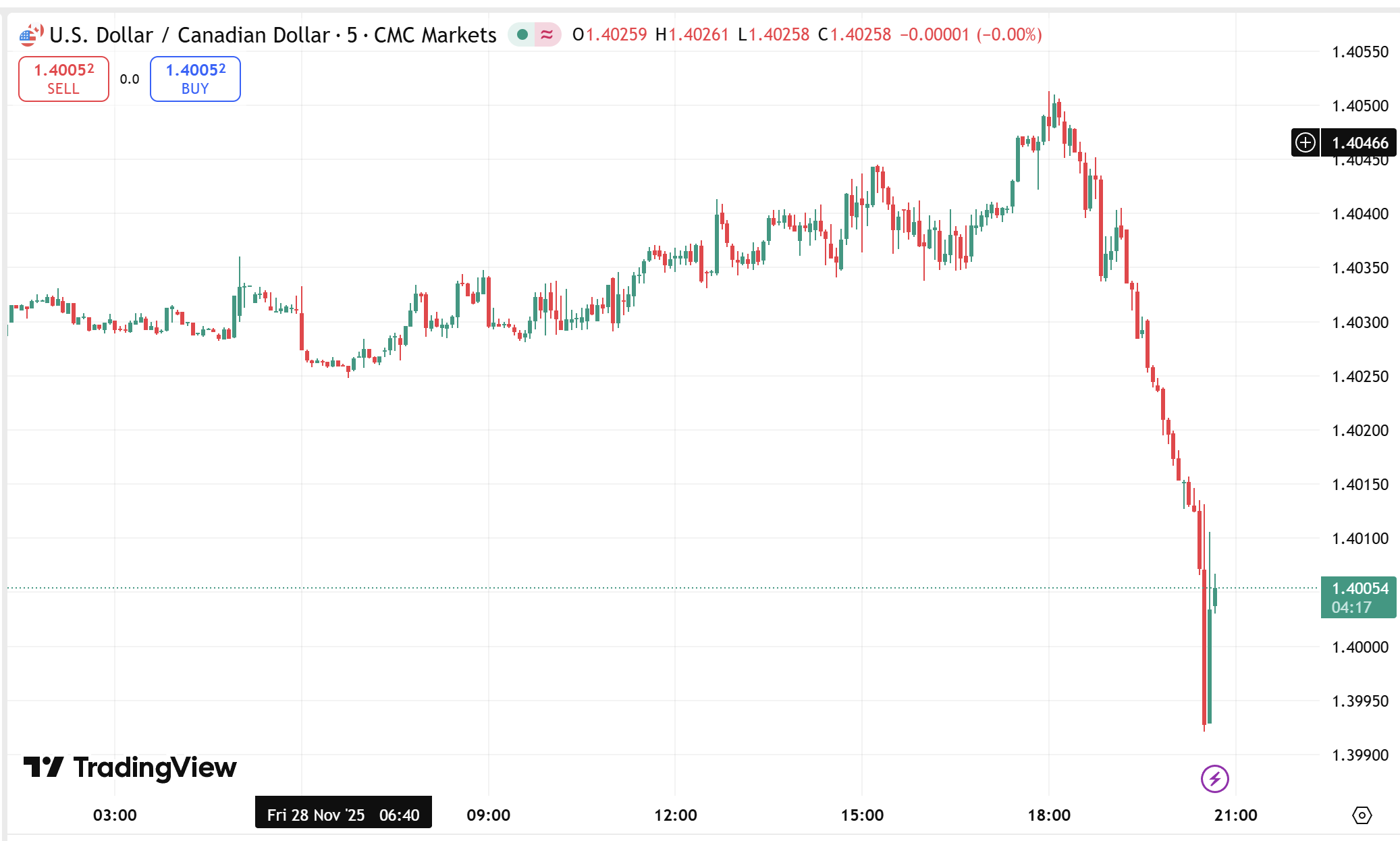 USDCAD đã bắt đầu giảm ngay trước khi dữ liệu được công bố, và đà giảm càng mạnh hơn sau đó — đặt câu hỏi liệu thị trường đã “rò rỉ” thông tin hay chỉ do thanh khoản mỏng khiến biến động tăng lên. Cặp tiền đã giảm xuống dưới mức thoái lui 50% từ đáy cuối tháng 10, mức 1.40135. Đây hiện là mức quan trọng mà các nhà giao dịch sẽ để ý nếu tiếp tục nghiêng về xu hướng giảm.